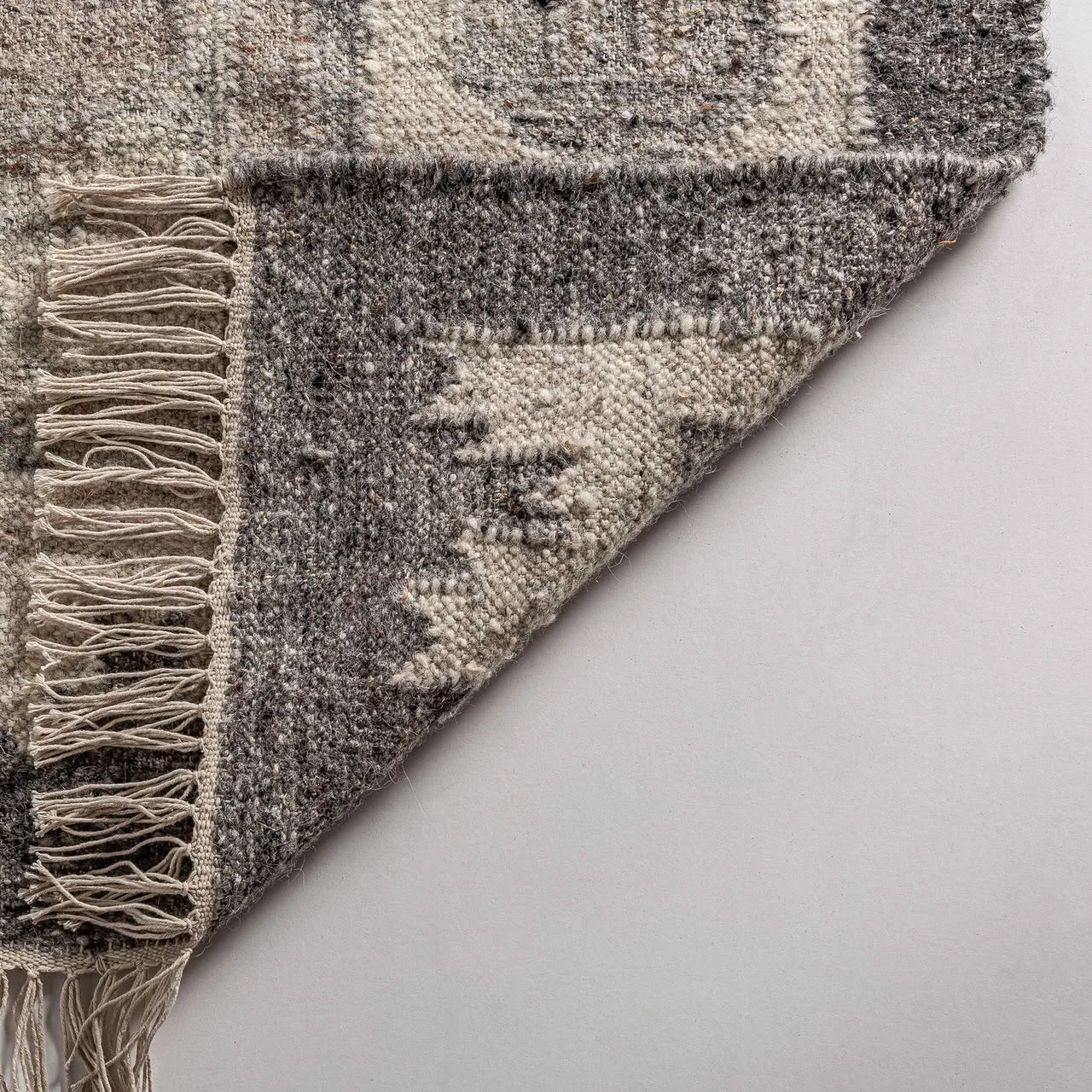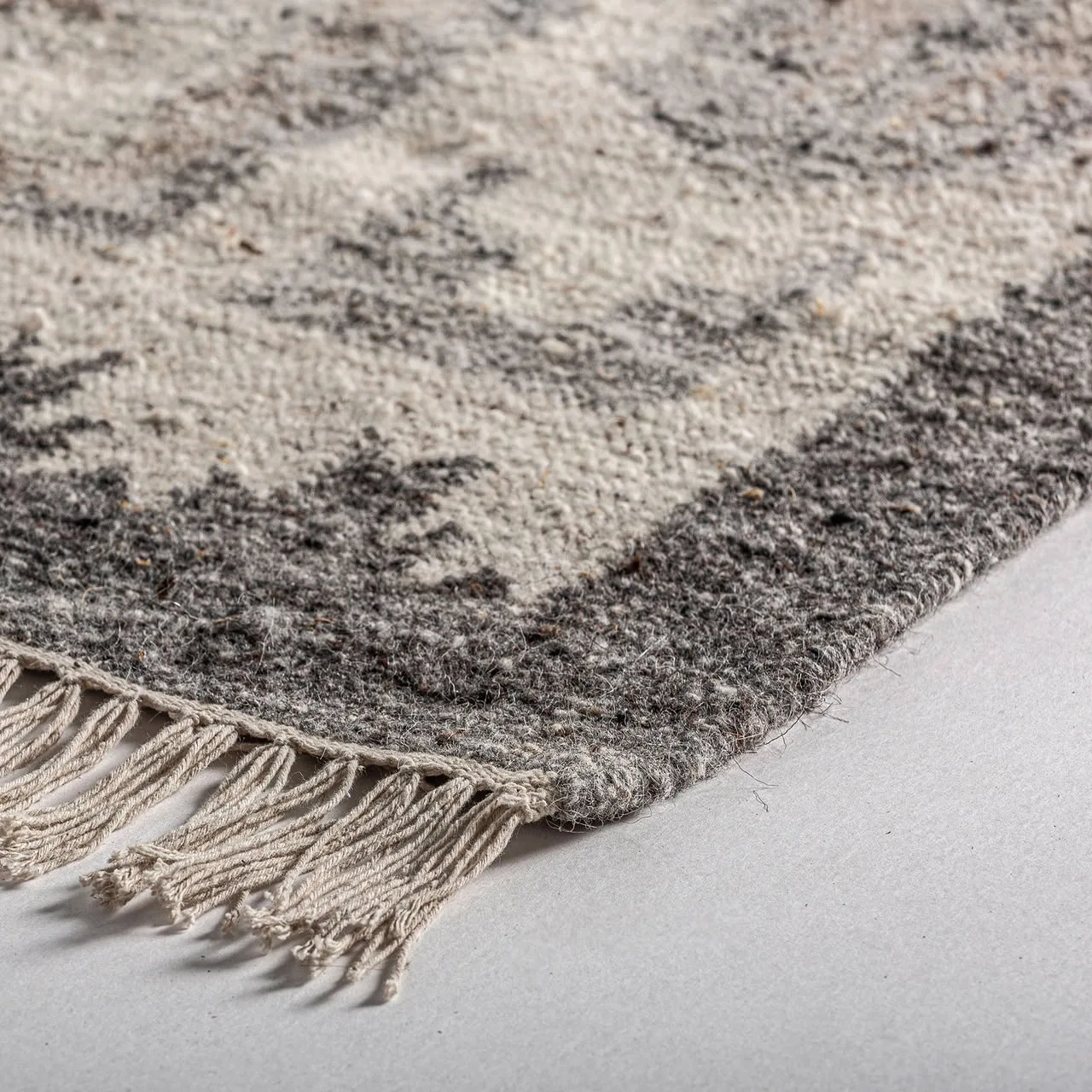 Alfombra kiara de estilo clásico, fabricado en lana en color gris, combinado con algodón en color crema y fibra natural.