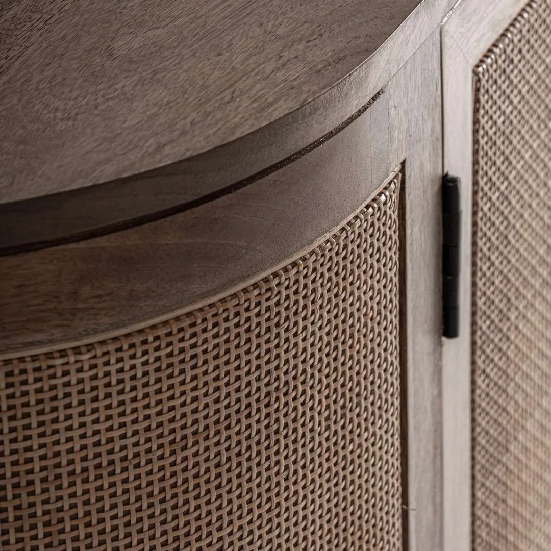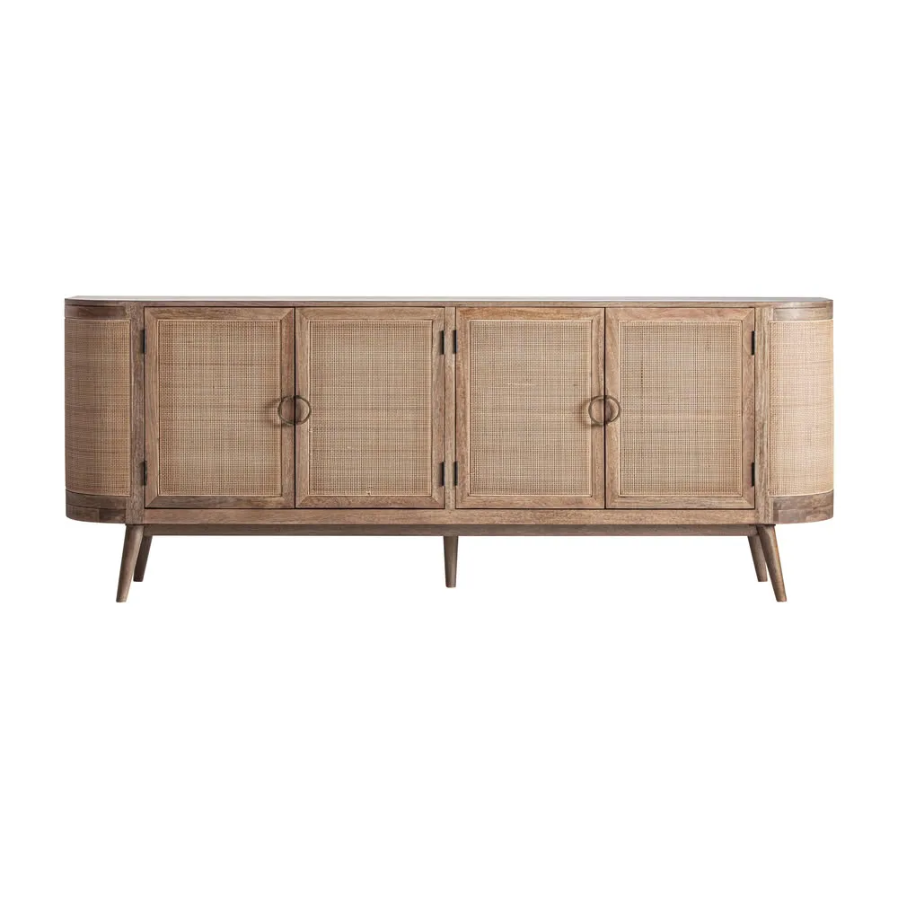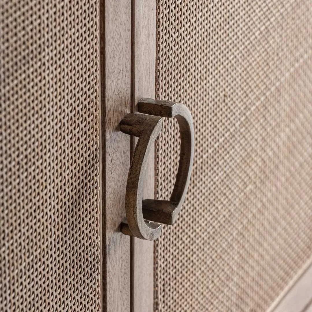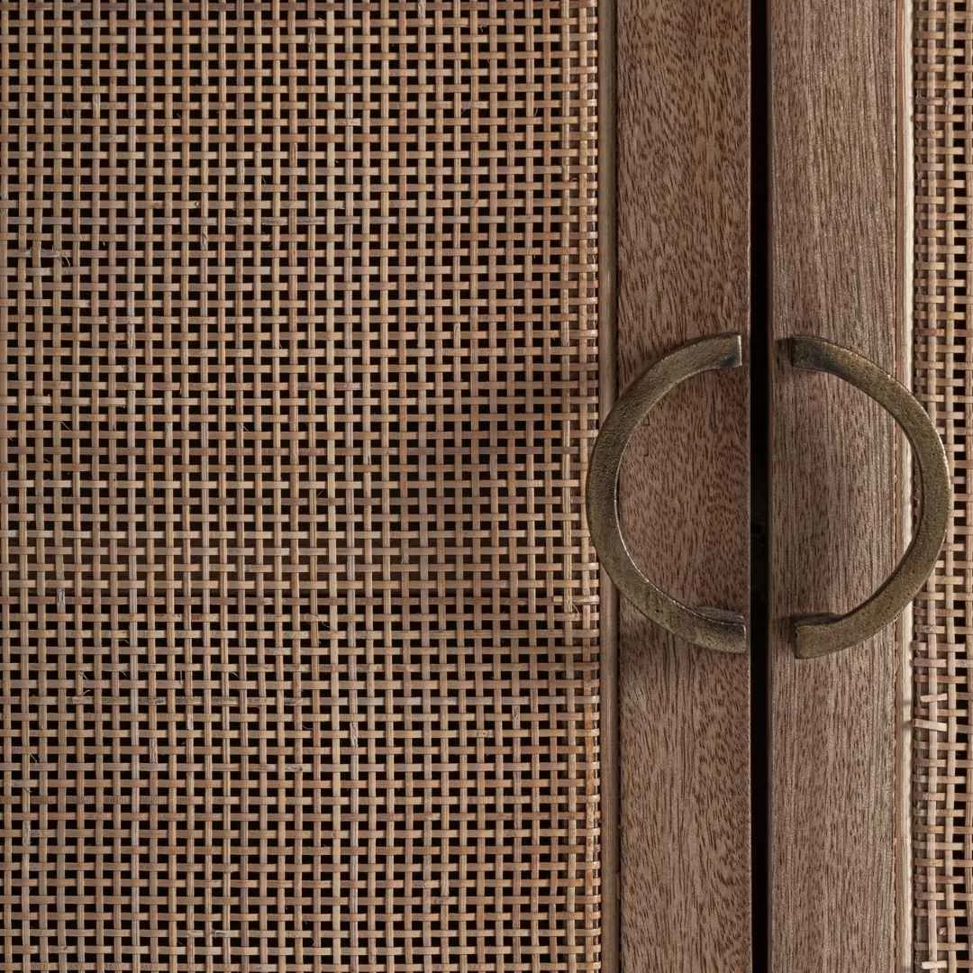 Aparador Beckley de estilo nórdico fabricado artesanalmente en madera de mango en color marrón combinado con ratán en color marrón claro. Producto desmontable.