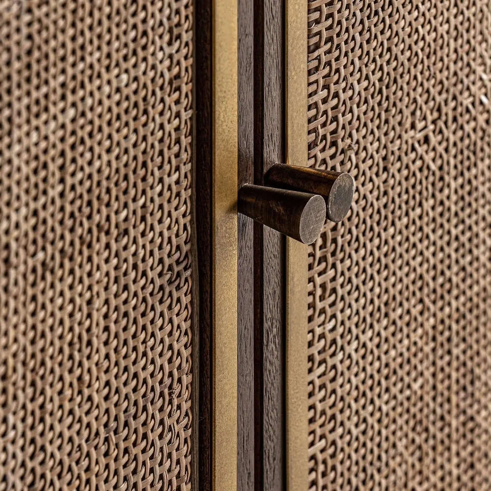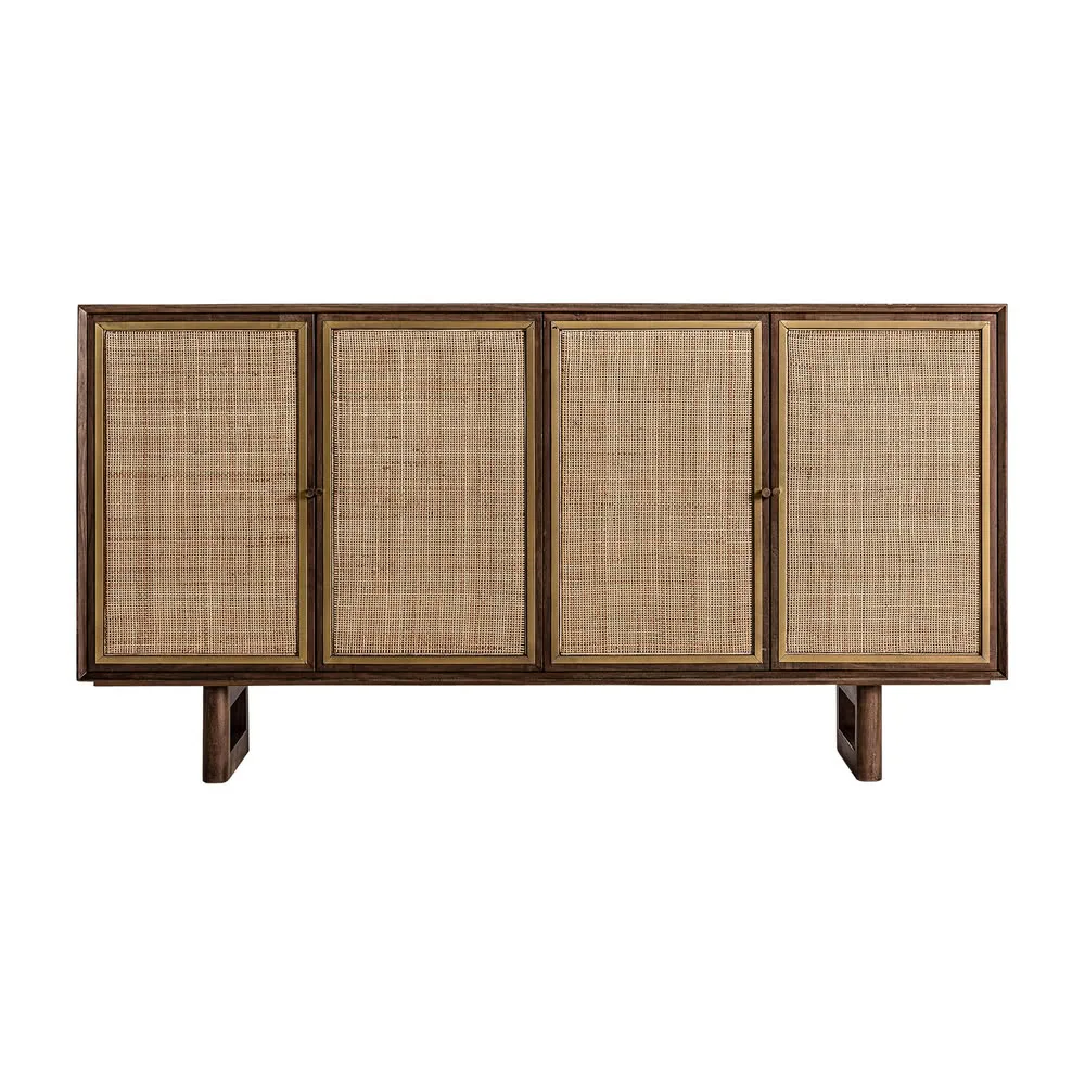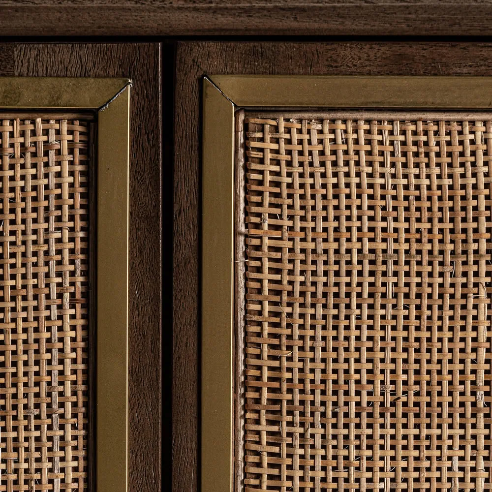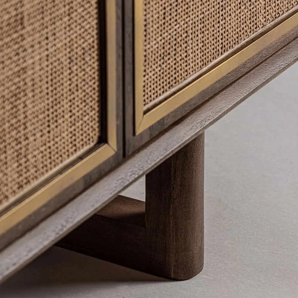 El aparador Gondorf combina la solidez de la madera de mango con la ligereza visual de las puertas de ratán, creando una pieza de estilo natural y relajado. Su diseño equilibra funcionalidad y carácter artesanal, aportando textura, calidez y un aire bohemio ideal para interiores de inspiración mediterránea, costera o contemporánea.