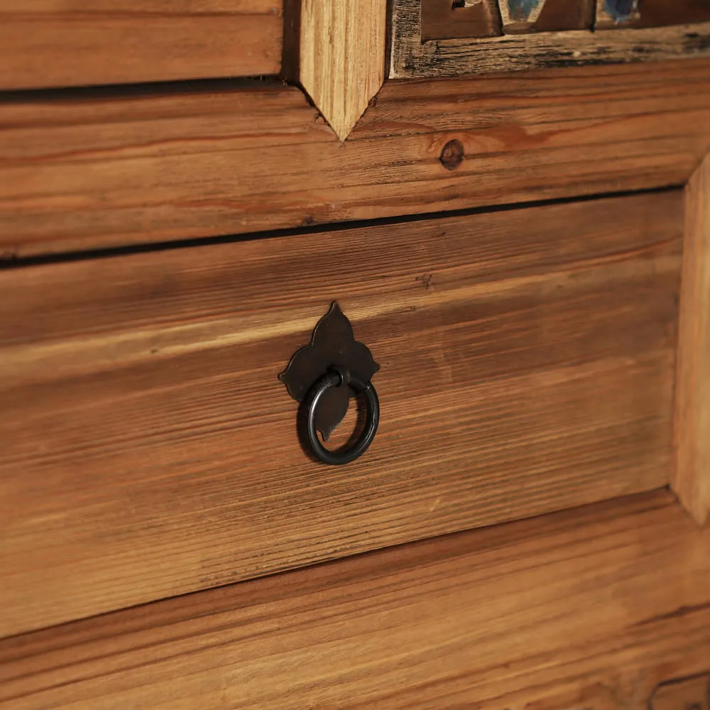 El aparador Prutz, con acabado natural en tonos azules, combina madera de pino reciclado y estética oriental. Su diseño artesanal y su paleta cromática lo convierten en una pieza decorativa con personalidad. Una propuesta de VICAL para interiores con sensibilidad artística.