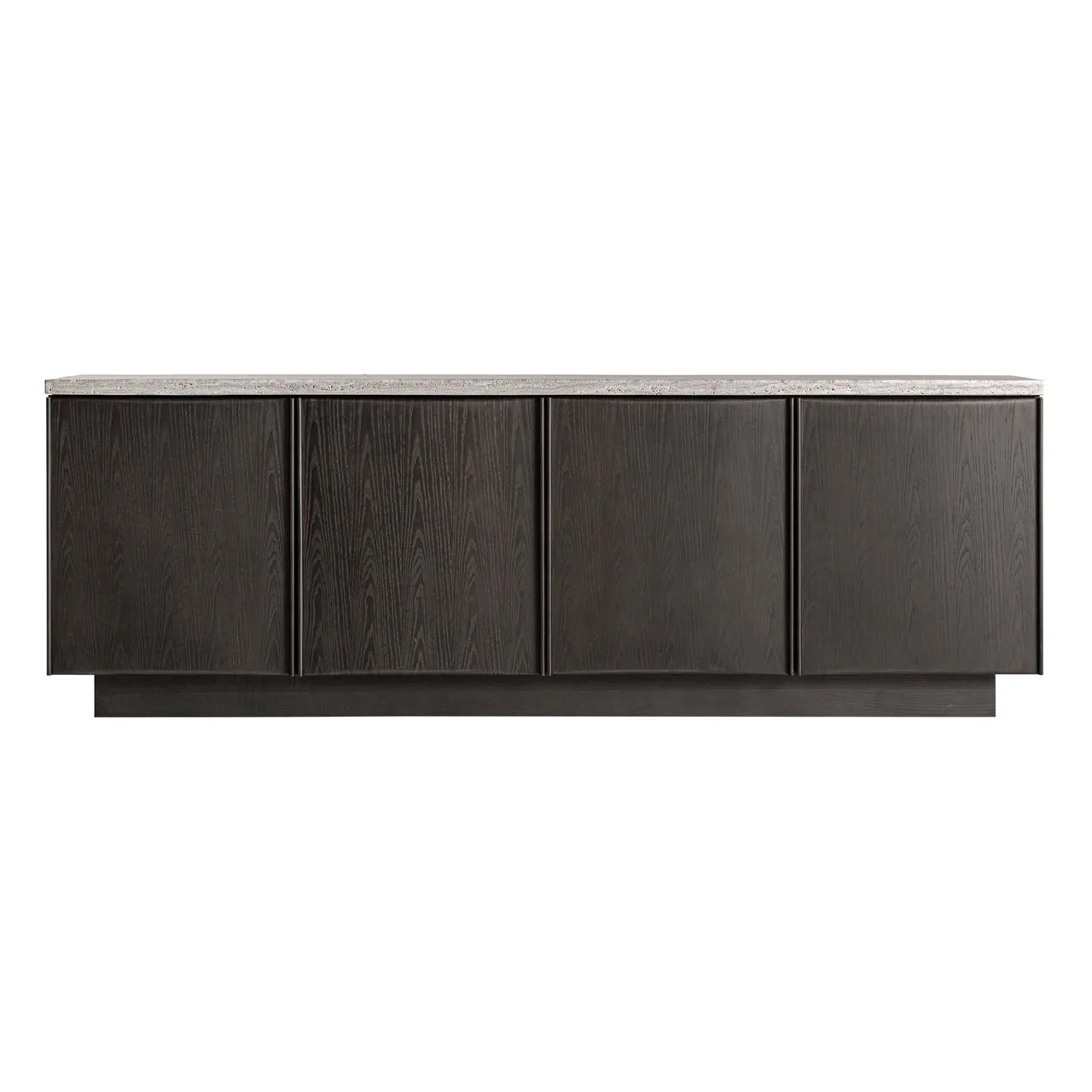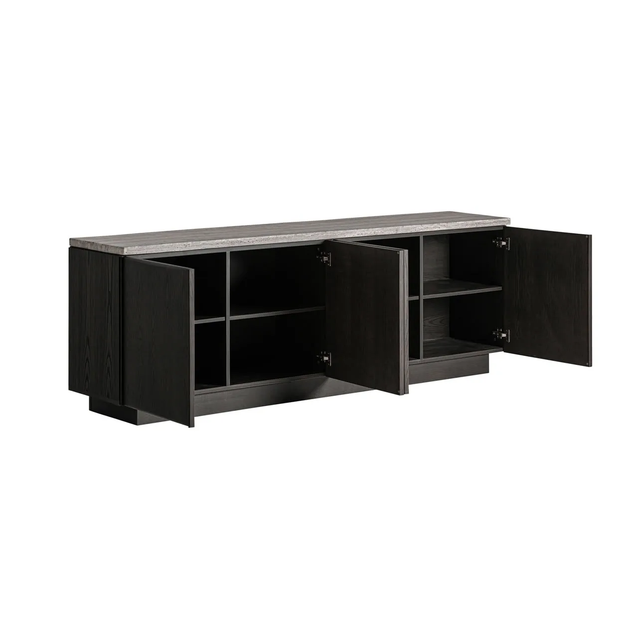 Aparador Rignac de estilo contemporáneo, fabricado en travertino en color gris, combinado con madera de fresno en color marrón.