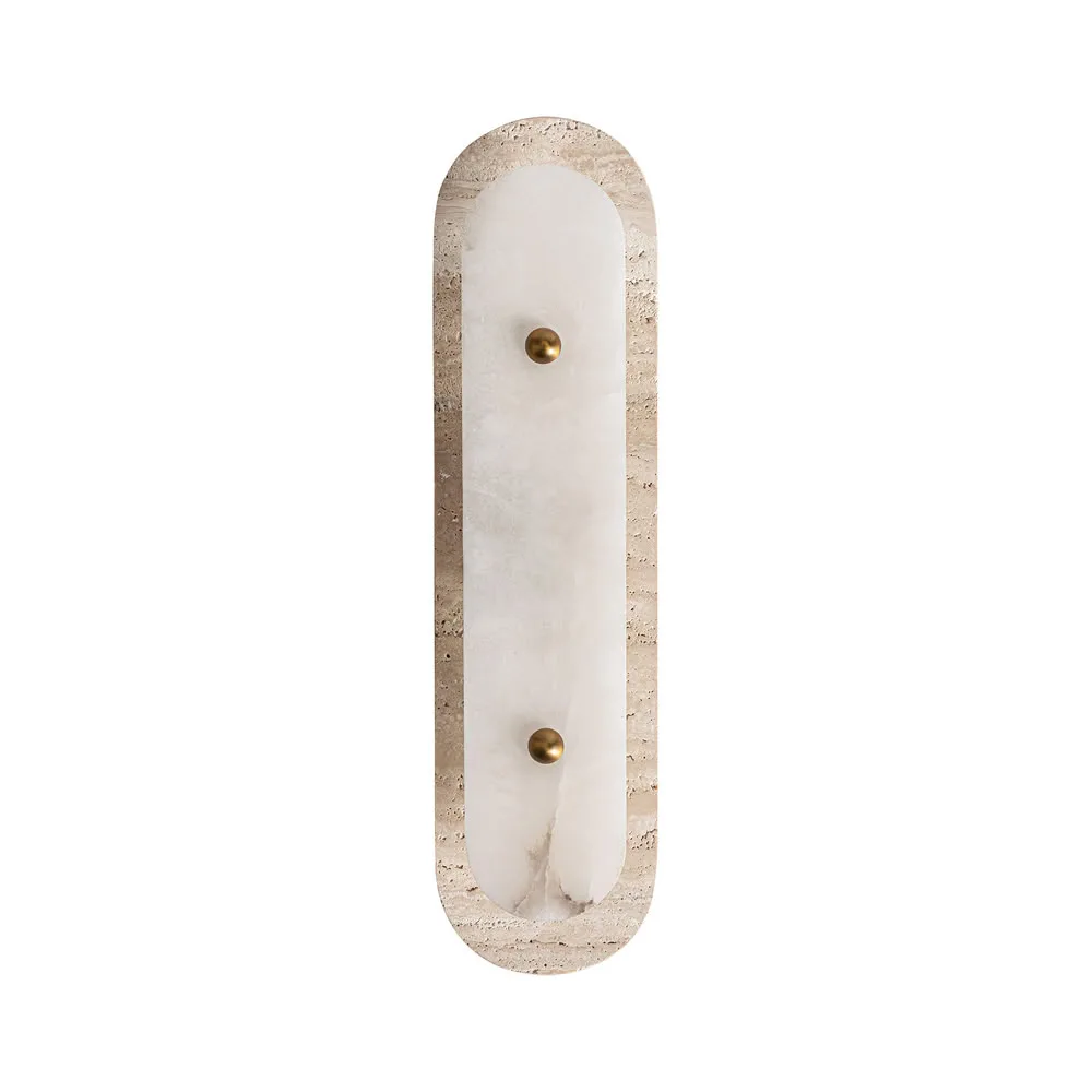 Aplique Tina de estilo art deco fabricado en travertino en color beige combinado con alabastro en color blanco y acero en color dorado.