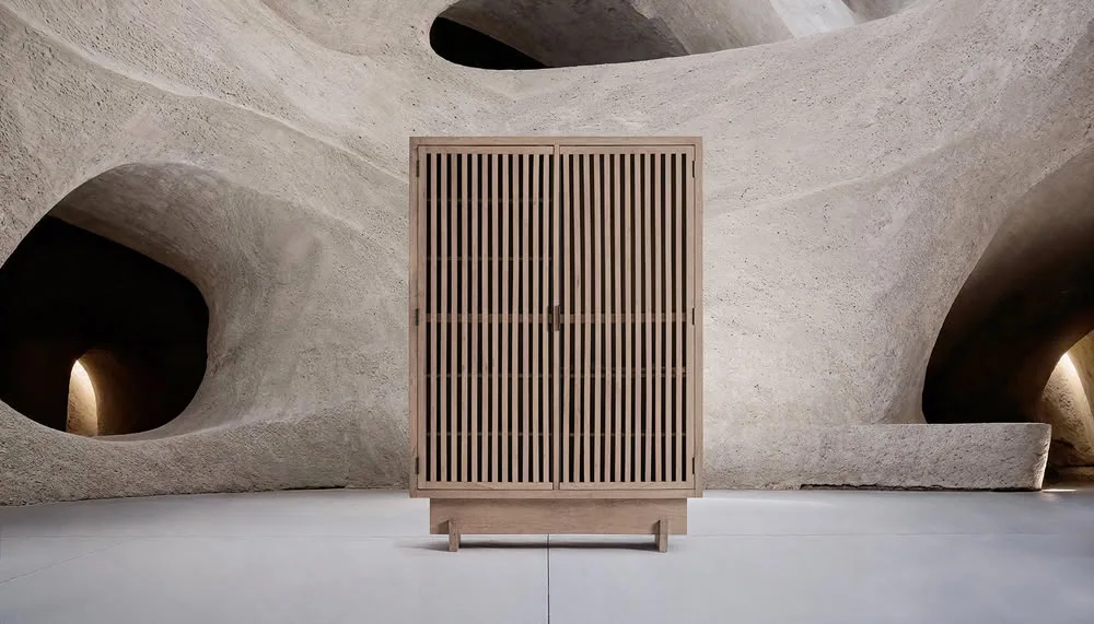 El Armario Gabia de VICALDESIGN evoca la esencia de los porticones japoneses: vertical, sobrio y sereno. Su estructura sólida contrasta con la ligereza visual del enrejado, que filtra la luz y proyecta sombras cambiantes. Más que un simple espacio de almacenaje, es un altar doméstico de calma y orden, capaz de transformar la atmósfera que lo rodea.