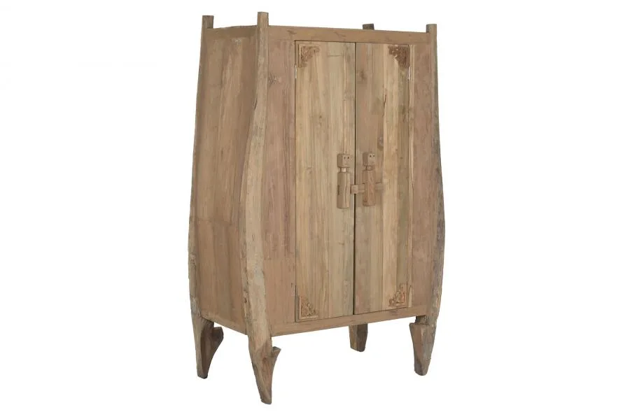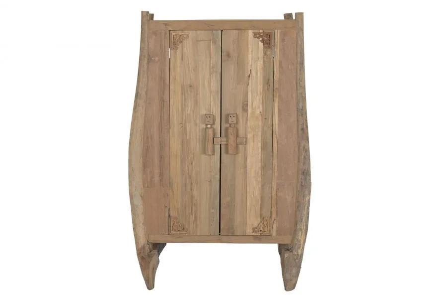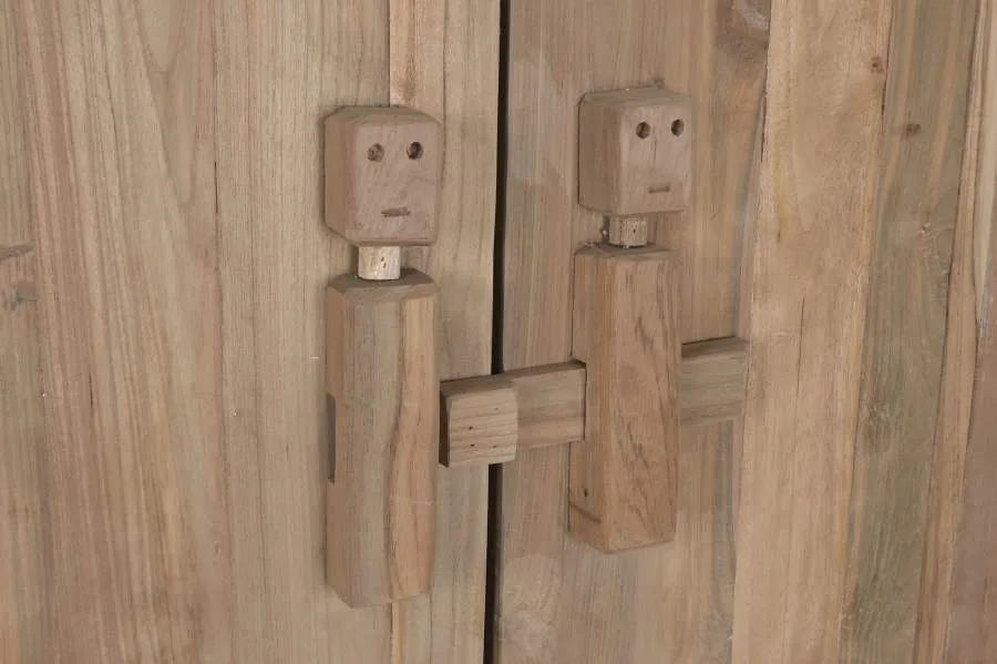 Armario de madera de teca maciza en color natural con tallado artesanal surtido y 2 puertas. Los motivos tallados a mano en las puertas convierten cada unidad en una pieza única e irrepetible, cargada de tradición artesanal indonesia. Una elección para dormitorios y salones que buscan un armario de madera maciza tallada con un acabado étnico y auténtico. Mide 95 cm de ancho, 58 cm de fondo y 172 cm de alto.