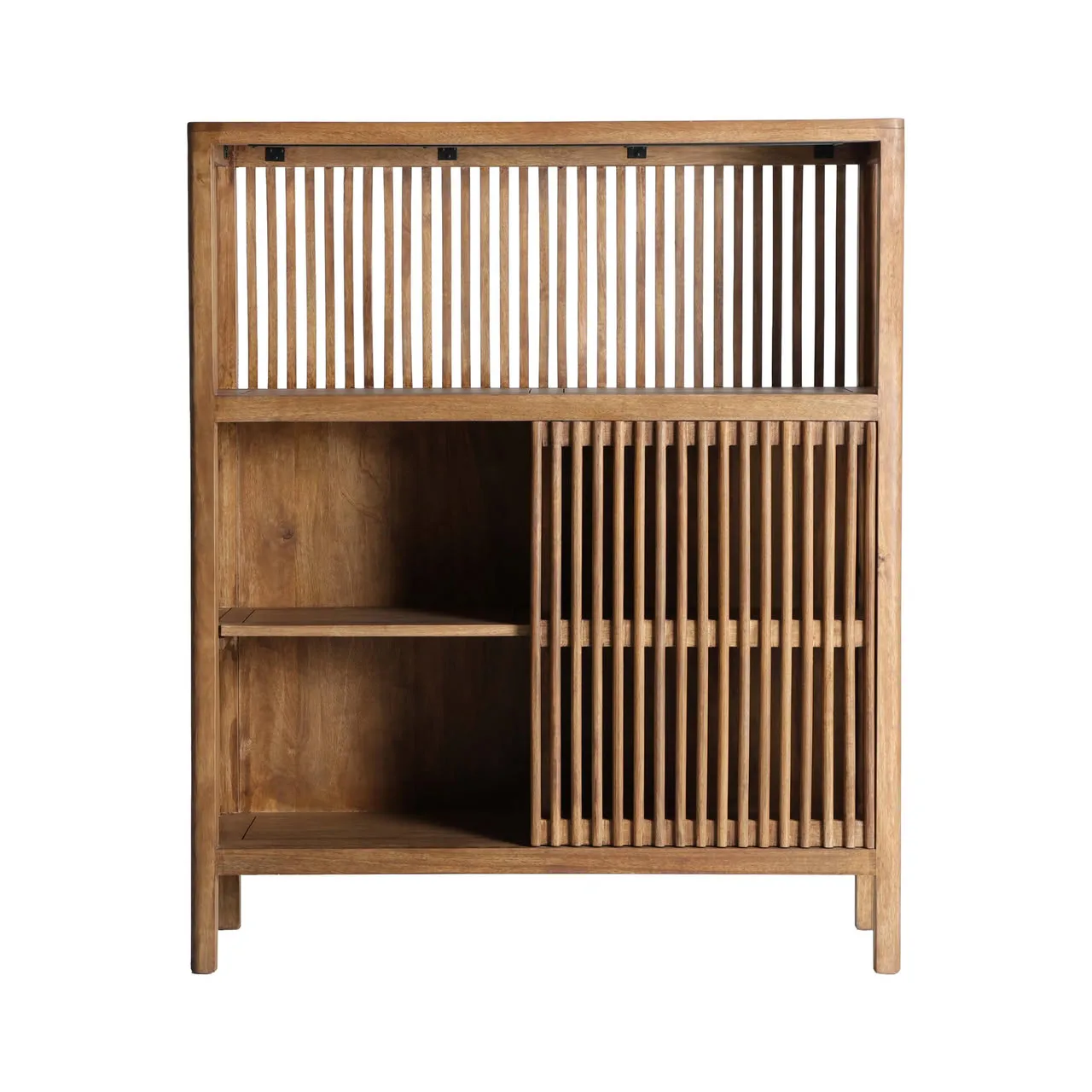 Sus 108 × 35 × 130 cm lo convierten en el armario estantería marrón oscuro perfecto para salones, despachos u oficinas minimalistas, aportando orden visual y un toque acogedor en cualquier ambiente. El acabado en madera natural de mango añade calidez a cualquier ambiente, integrándose en diversos estilos decorativos.