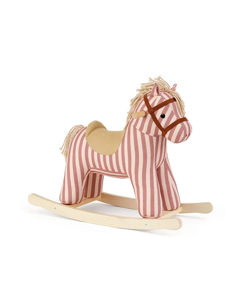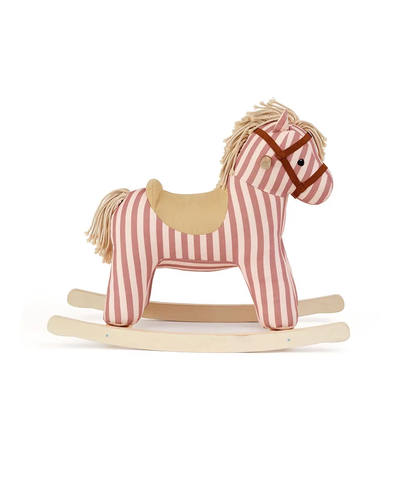 Caballito balancín de madera y lona de algodón de rayas rosa Mila. Los caballos balancín son ideales para desarrollar el equilibrio y la coordinación de los niños. Lo convierten en un compañero encantador para los pequeños jinetes y añaden un toque decorativo a la habitación. Este balancín de madera tiene una suave cola de algodón y un juguetón pelo en la cabeza.