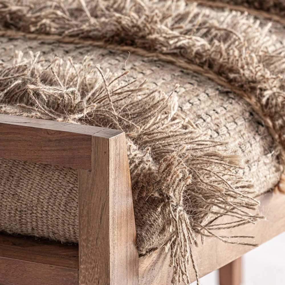 El banco Corao combina madera de mango en tonos cálidos con un asiento tapizado en algodón y yute en matices neutros, creando una pieza acogedora y natural perfecta para entradas, dormitorios o espacios de estilo sereno. Su fabricación artesanal garantiza carácter único, con variaciones propias de los materiales que enriquecen su autenticidad.