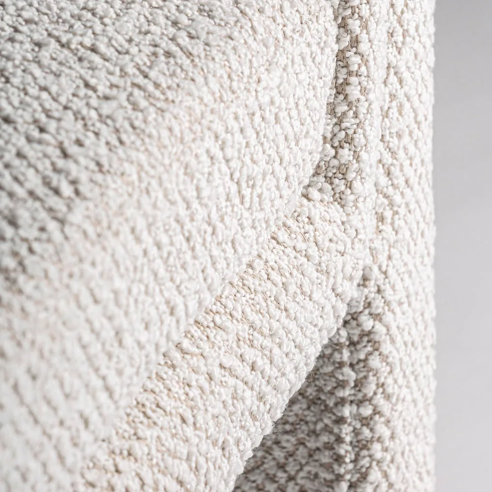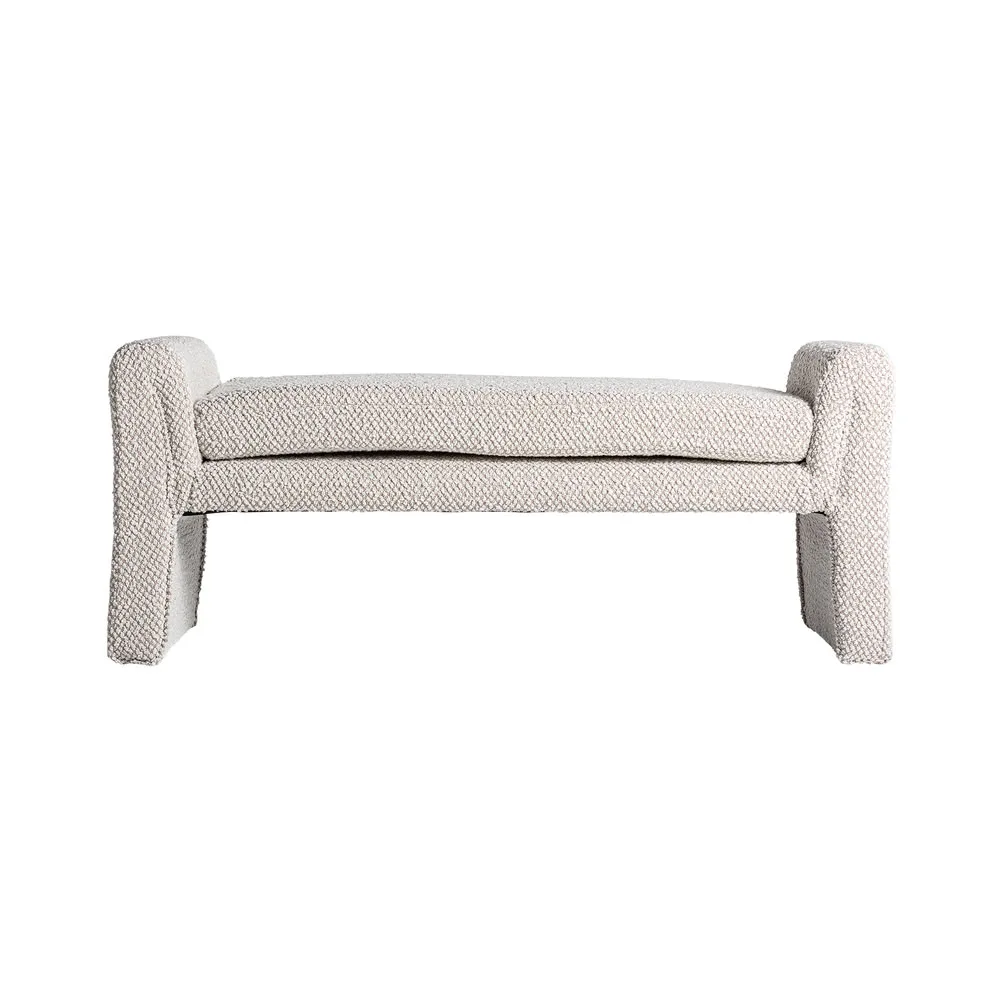 Banco rectangular izegem de estilo art deco, fabricado en algodón bouclé en color blanco roto con acabado liso, combinado con acrílico y madera de caucho. Producto desenfundable.