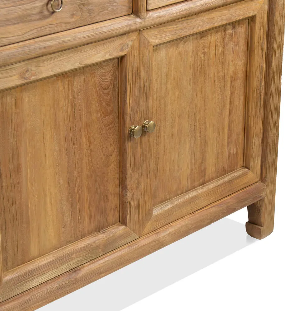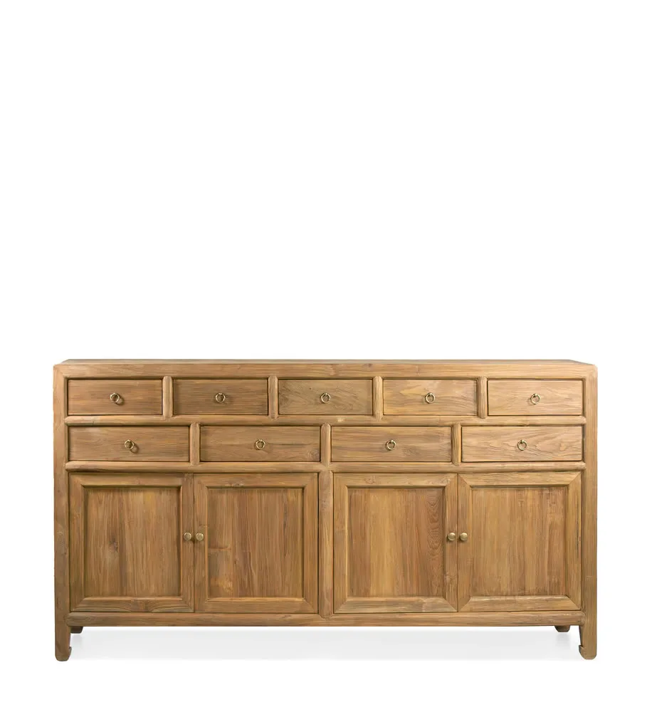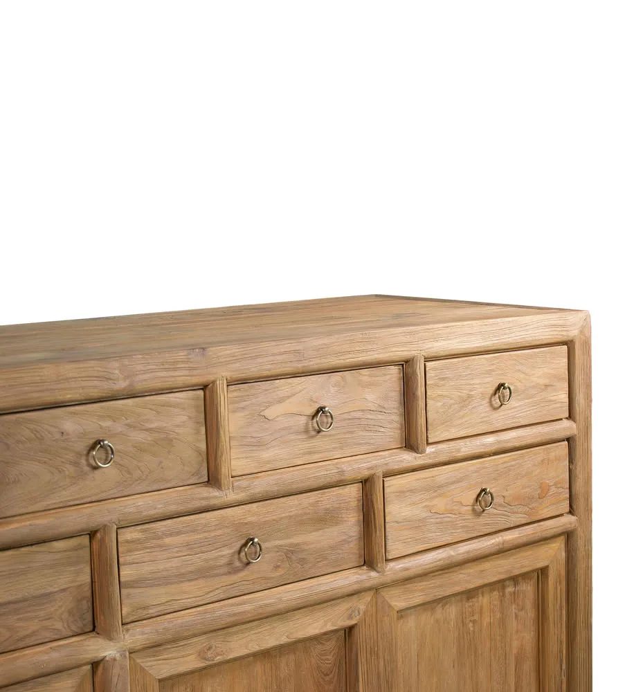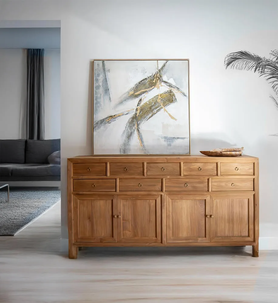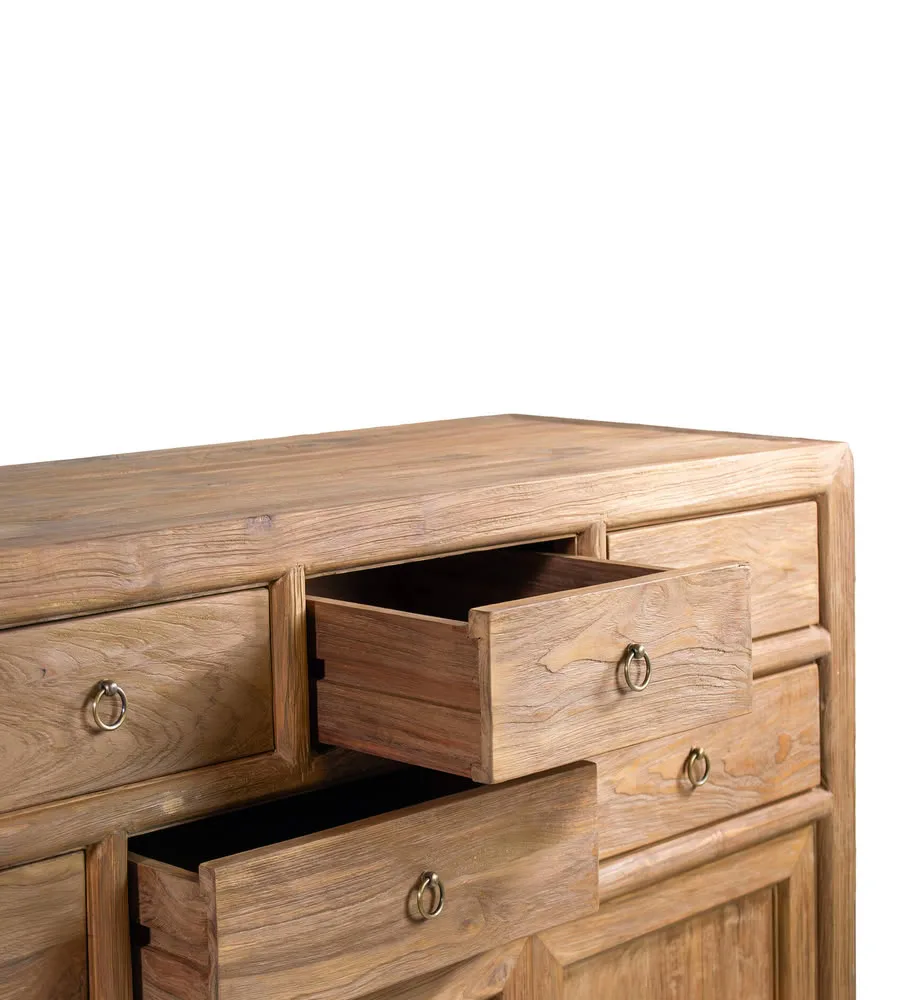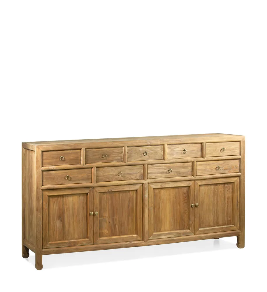 El Bufet Mérida de teca reciclada 9 cajones y 4 puertas 180 x 40 cm es una pieza artesanal de gran presencia, elaborada en madera maciza de teca reciclada. Su diseño combina una amplia capacidad de almacenaje con una estética natural y auténtica, gracias a la combinación de cajones y puertas que permiten organizar todo tipo de objetos con comodidad. Cada bufet es único, con variaciones propias del material reciclado que aportan carácter y personalidad, ideal para salones y comedores de estilo natural, mediterráneo o contemporáneo.