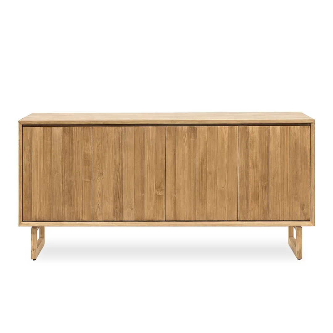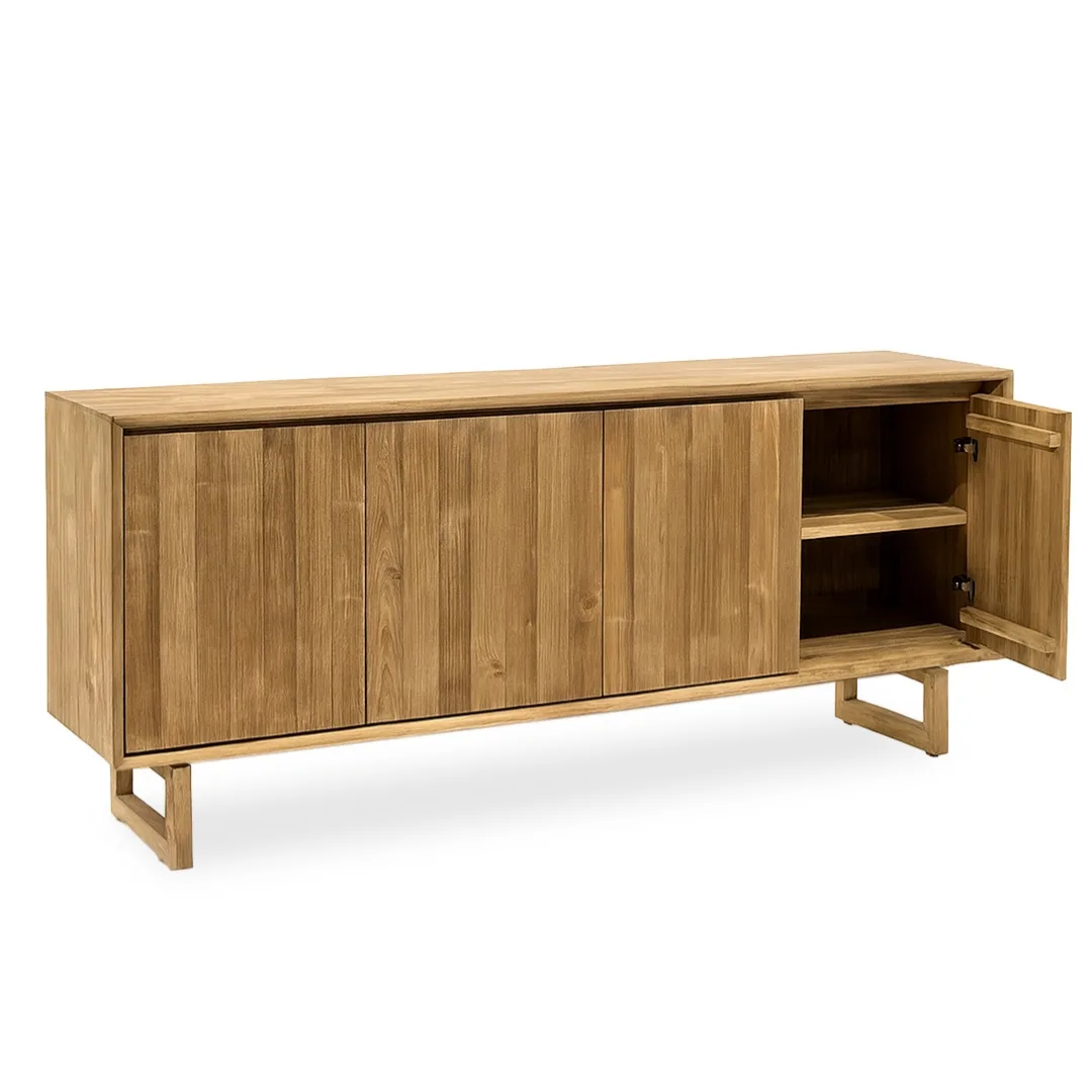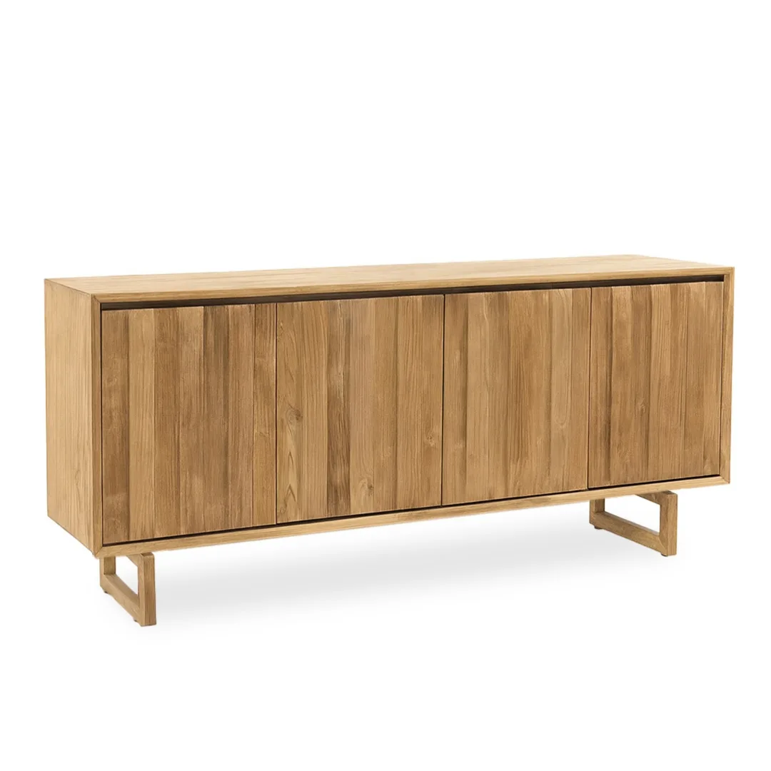 El Bufet Pedralbes de teca 4 puertas 180 x 45 cm es una pieza robusta y elegante, elaborada artesanalmente en madera maciza de teca. Su diseño sobrio y equilibrado ofrece una amplia capacidad de almacenaje, ideal para organizar vajilla, textiles u objetos decorativos en salones y comedores. Las vetas naturales y la calidez propia de la teca aportan carácter y un estilo atemporal que encaja perfectamente en interiores de inspiración natural, mediterránea o contemporánea.