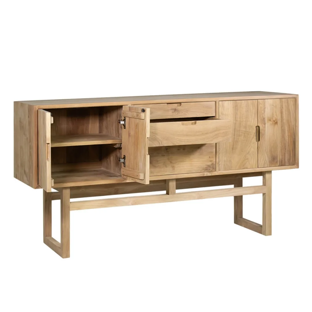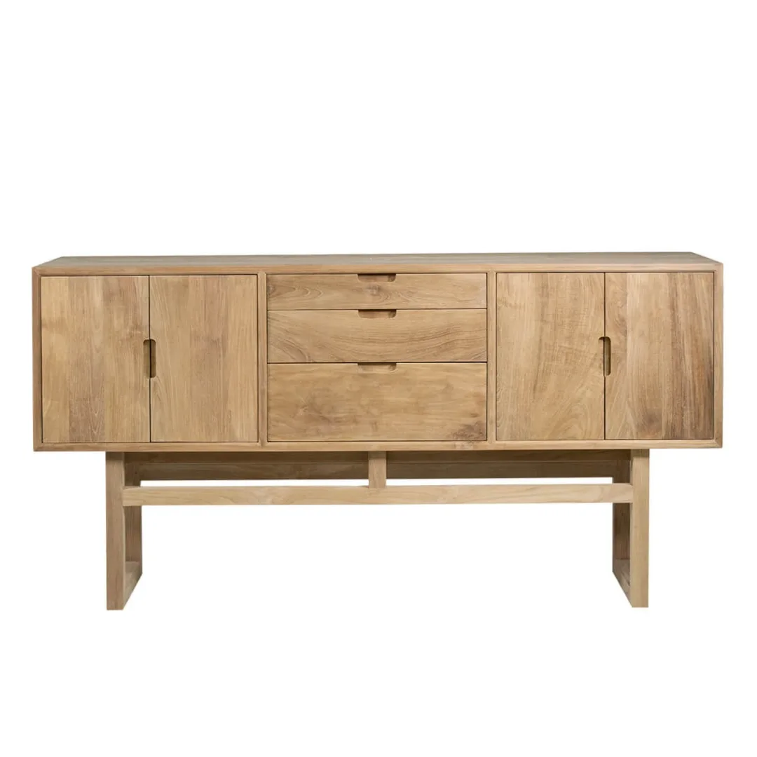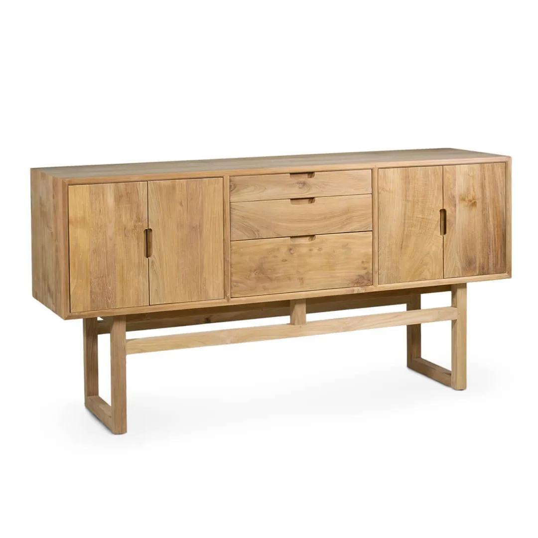 El Bufet Tenerife de teca 3 cajones y 4 puertas 157 x 42 cm es un mueble funcional y elegante, fabricado artesanalmente en madera maciza de teca. Su diseño equilibrado combina una amplia capacidad de almacenaje con una estética natural y atemporal, ideal para salones y comedores. Los cajones y puertas permiten organizar vajilla, textiles u objetos decorativos con comodidad, mientras que la calidez de la teca aporta carácter y sofisticación al espacio.