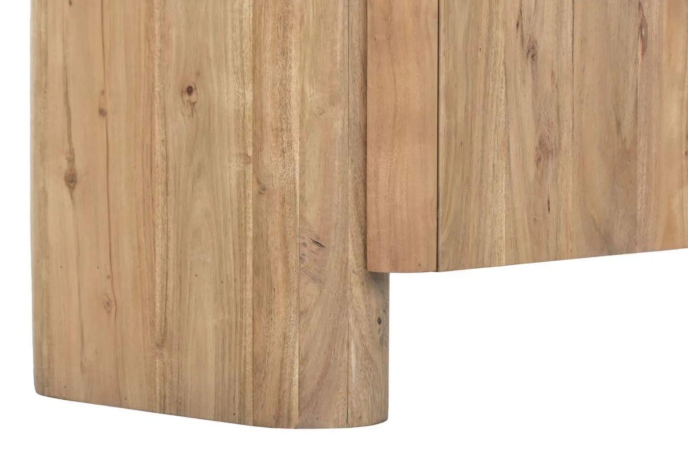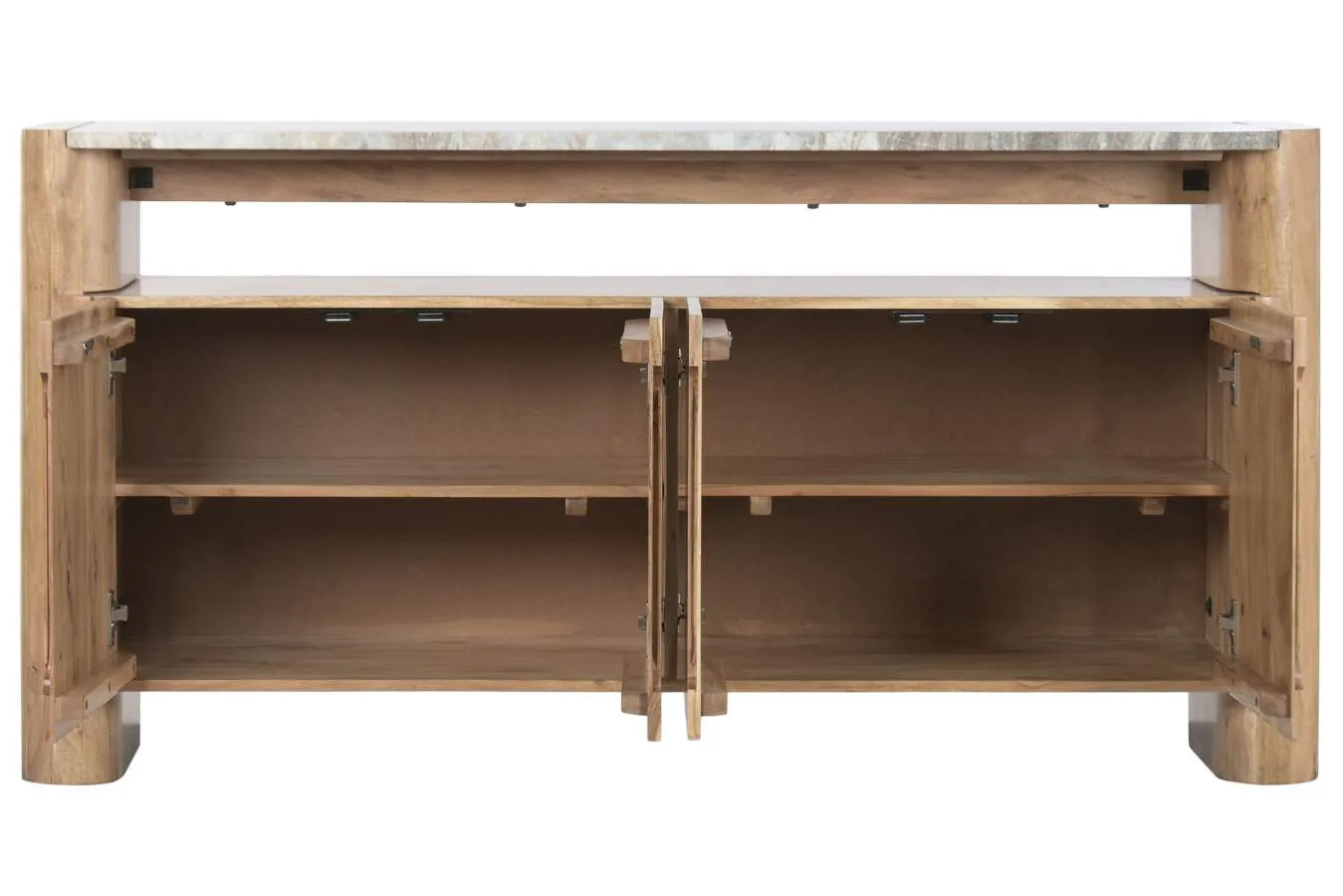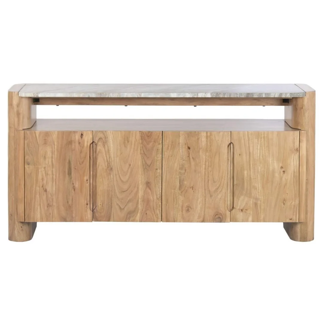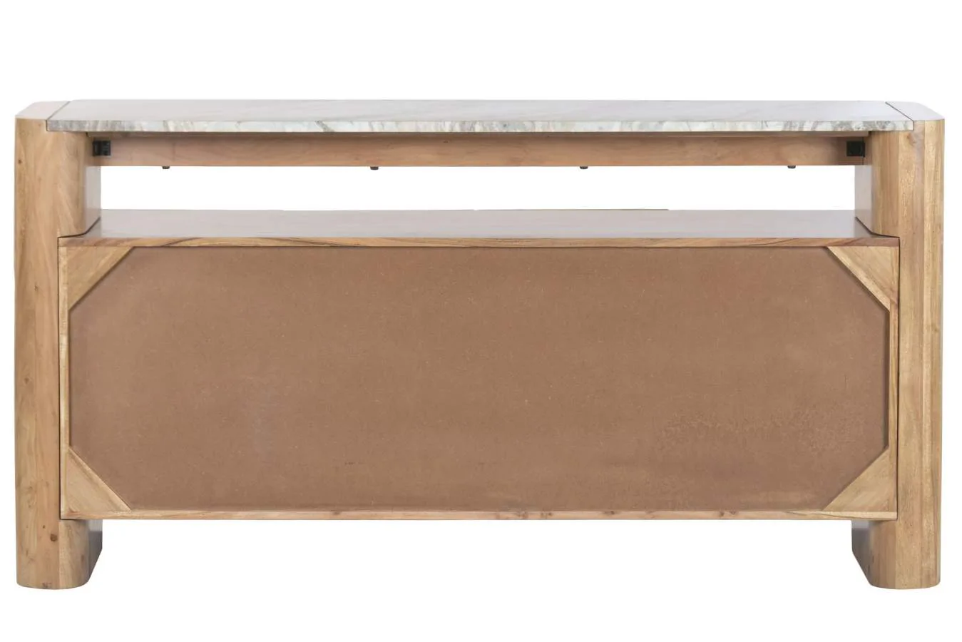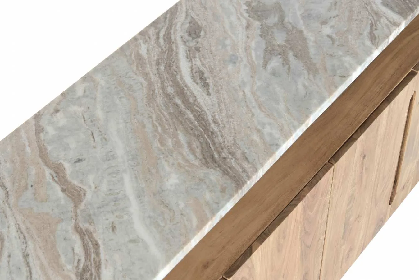 Buffet de madera de acacia con tablero de mármol en tonos naturales y marrón, con 4 puertas y estantes interiores. Una combinación de materiales naturales que aporta elegancia y sofisticación a comedores y salones. Mide 160 cm de ancho, 40 cm de fondo y 80 cm de alto.