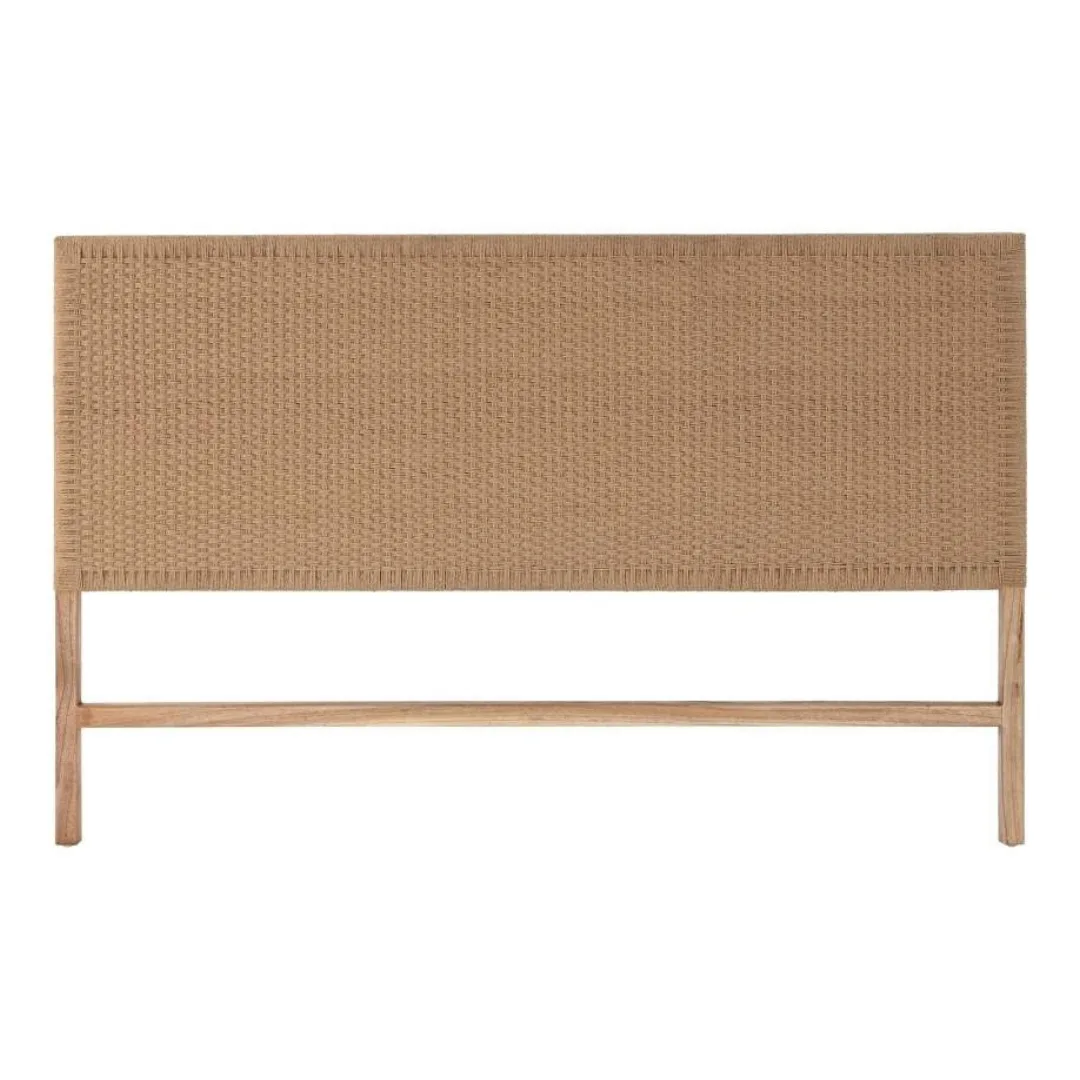 Cabecero de cama de madera de teca y fibra natural en color natural, de estilo boho y étnico. Su diseño artesanal con tejido de fibra aporta textura y calidez al dormitorio, creando un ambiente relajado y acogedor. Ideal para camas de 150 cm, combina a la perfección con ropa de cama en tonos naturales y muebles de madera maciza.