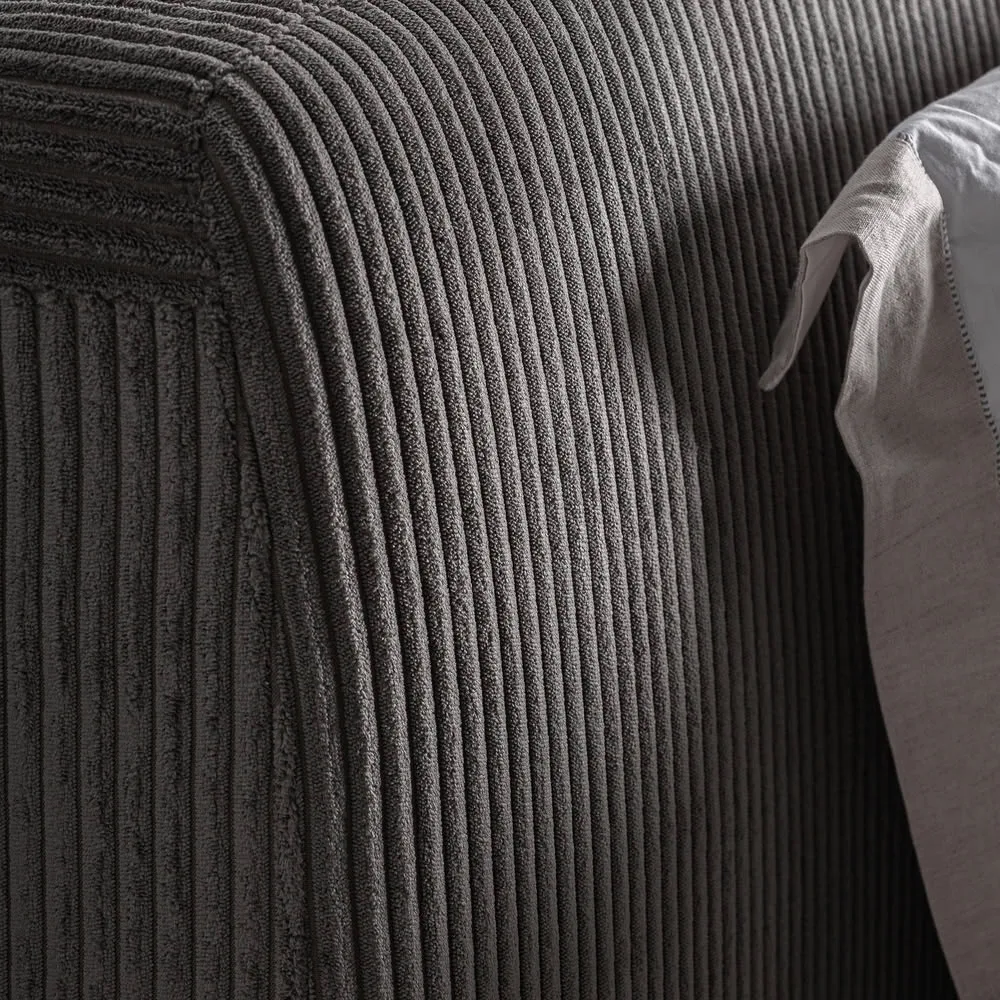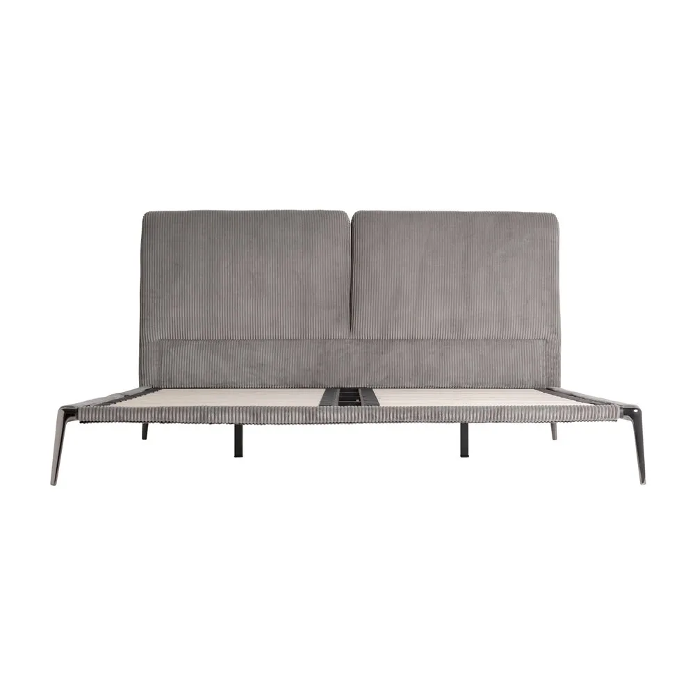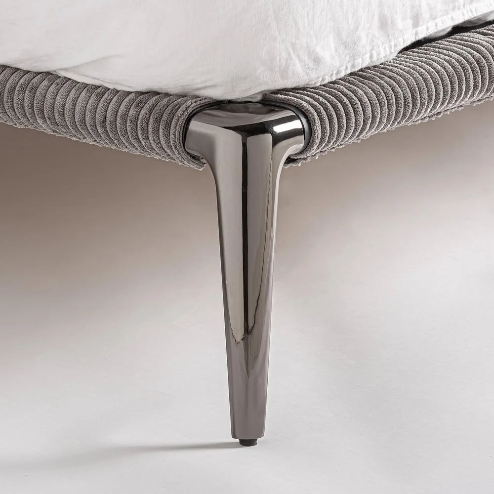 Cama Berlin de estilo contemporáneo fabricado en tela en color gris con acabado oscuro combinado con acero inoxidable en color gris y madera de pino.