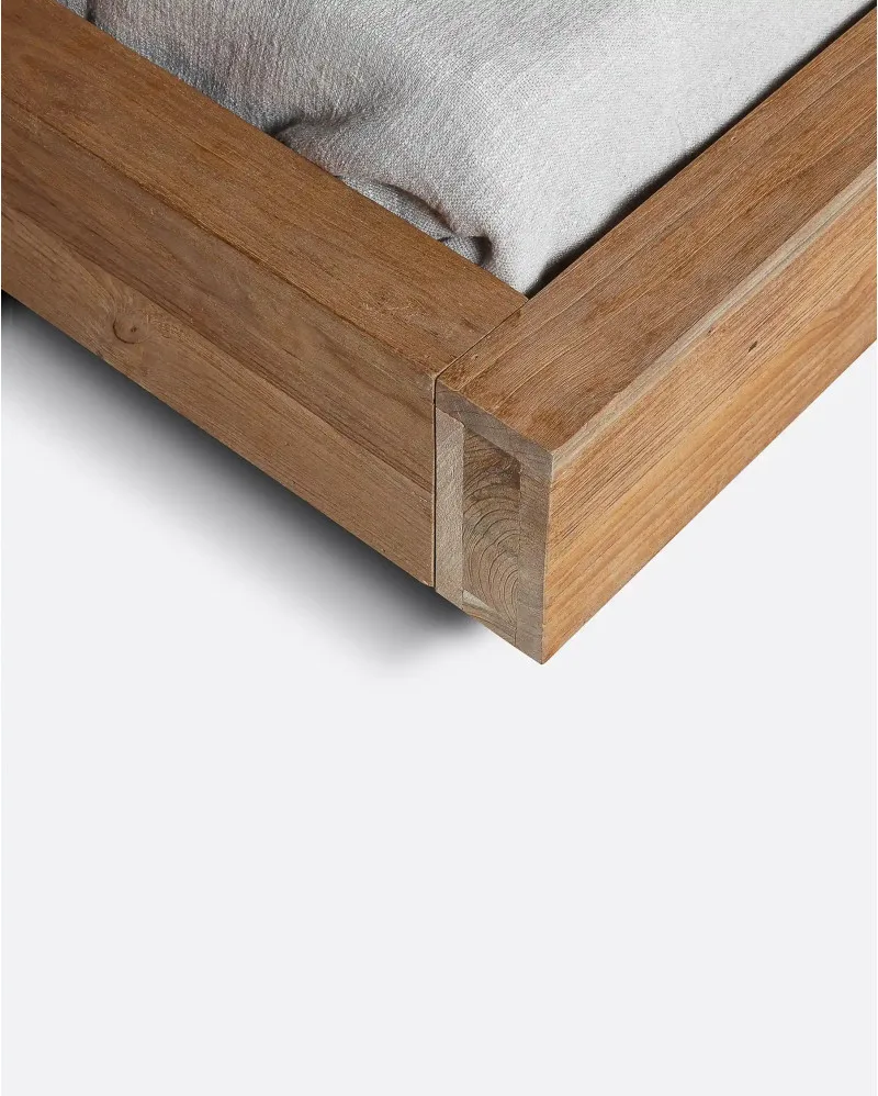 La cama de madera de teca NORI de Dareels está elaborada en madera de teca reciclada, un material noble que destaca por su resistencia, su belleza natural y su carácter único.
