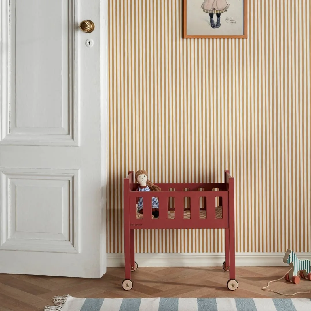 La cama de muñecas de madera con ruedas es una pieza encantadora inspirada en los patrones y detalles decorativos del hogar de Carl y Karin Larsson. Sus extremos cortos presentan tréboles de cuatro hojas calados, un símbolo recurrente en las pinturas y bordados de su casa, que aporta un toque artístico y lleno de historia. El juego de cama, confeccionado en algodón, incluye sábana y edredón unidos con un patrón reversible a cuadros y rayas en tonos suaves, además de una almohada a juego.