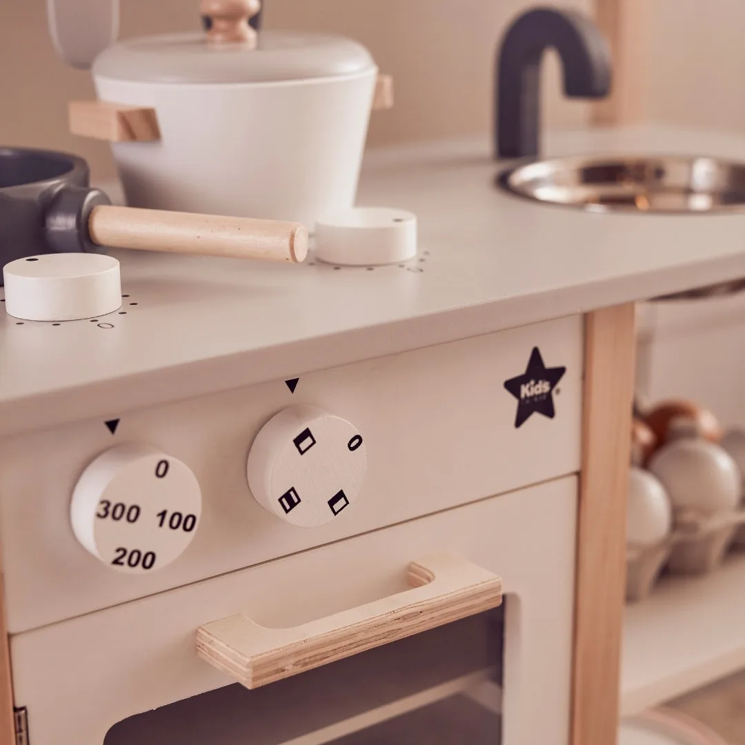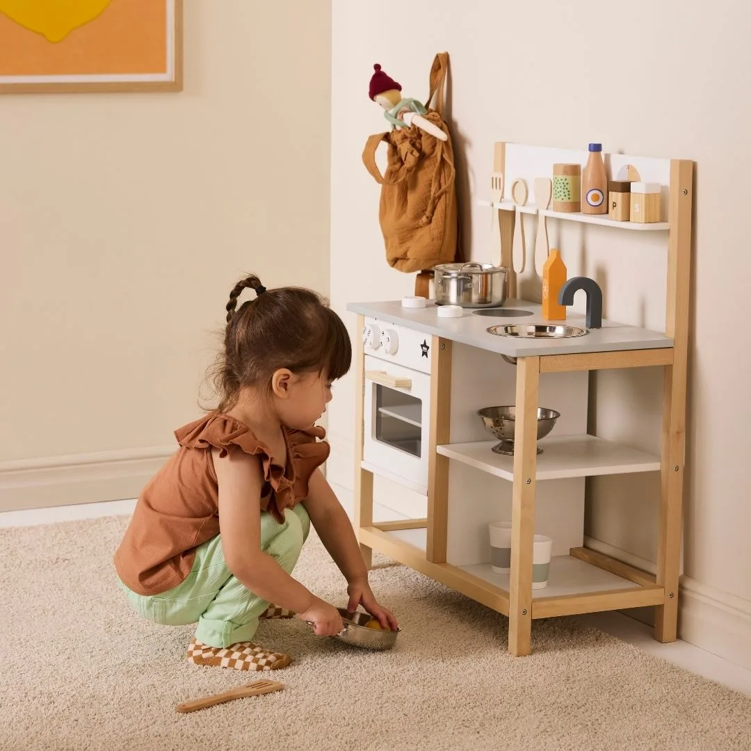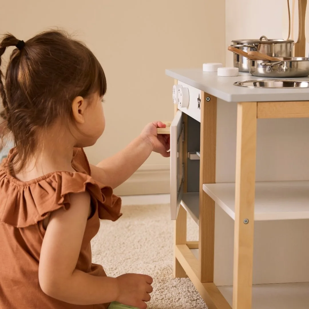 La cocina de juguete de madera es el complemento perfecto para pequeños chefs y reposteros en potencia. Con un diseño cuidado y natural, esta cocina incluye numerosos accesorios que enriquecen el juego: un reloj ajustable, cacerolas, sartenes, utensilios, un fregadero metálico y un horno con puerta abatible. Cada detalle está pensado para inspirar creatividad, juego simbólico y diversión durante horas.