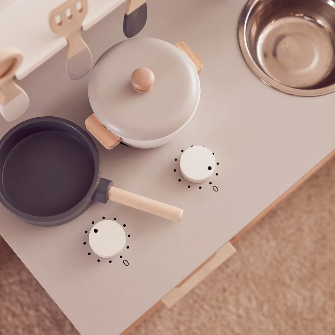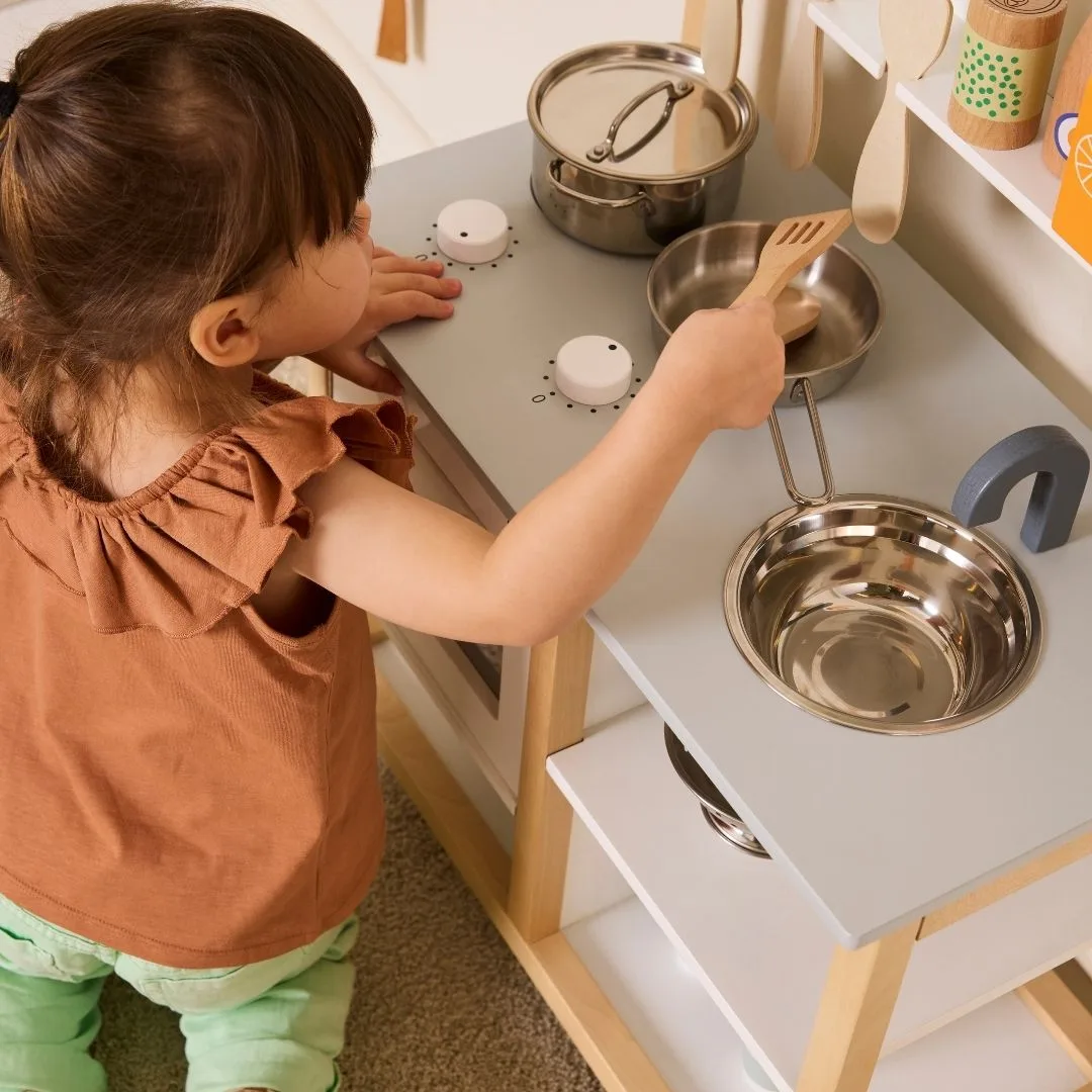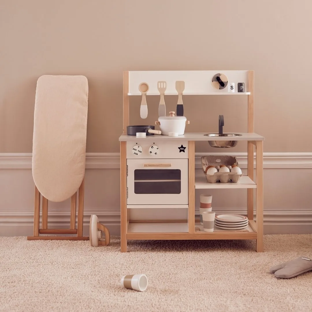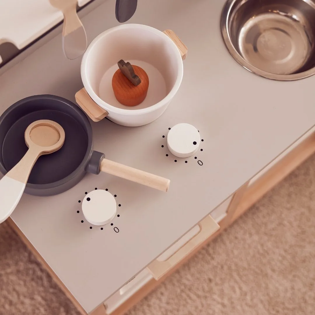 La cocina de juguete de madera es el complemento perfecto para pequeños chefs y reposteros en potencia. Con un diseño cuidado y natural, esta cocina incluye numerosos accesorios que enriquecen el juego: un reloj ajustable, cacerolas, sartenes, utensilios, un fregadero metálico y un horno con puerta abatible. Cada detalle está pensado para inspirar creatividad, juego simbólico y diversión durante horas.