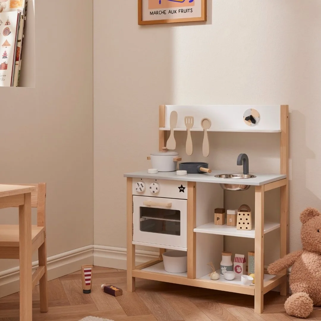 Fabricada con materiales resistentes y acabados al agua, su estructura combina madera para ofrecer una pieza duradera y estable. El estilo neutro permite integrarla con facilidad en cualquier habitación infantil o zona de juegos. Una opción ideal si deseas comprar una cocina infantil completa, segura y diseñada para fomentar la imaginación.