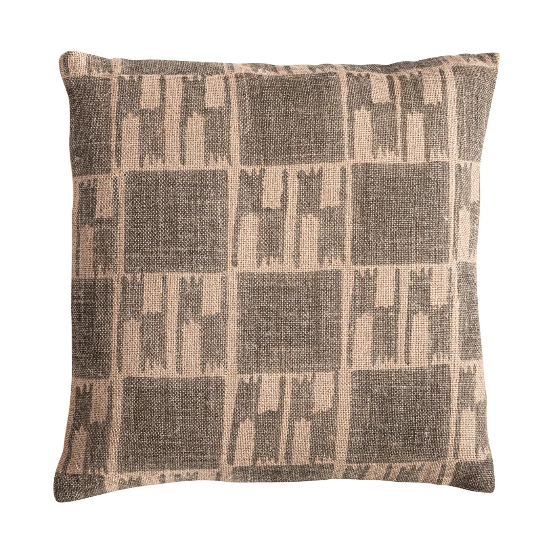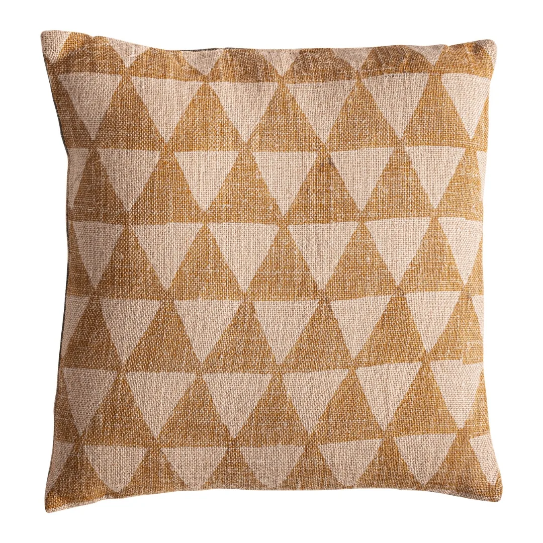 Cojín Khonsu de estilo clásico fabricado en yute en color beige combinado con fibra natural en color ocre. Producto desenfundable. Incluye relleno.