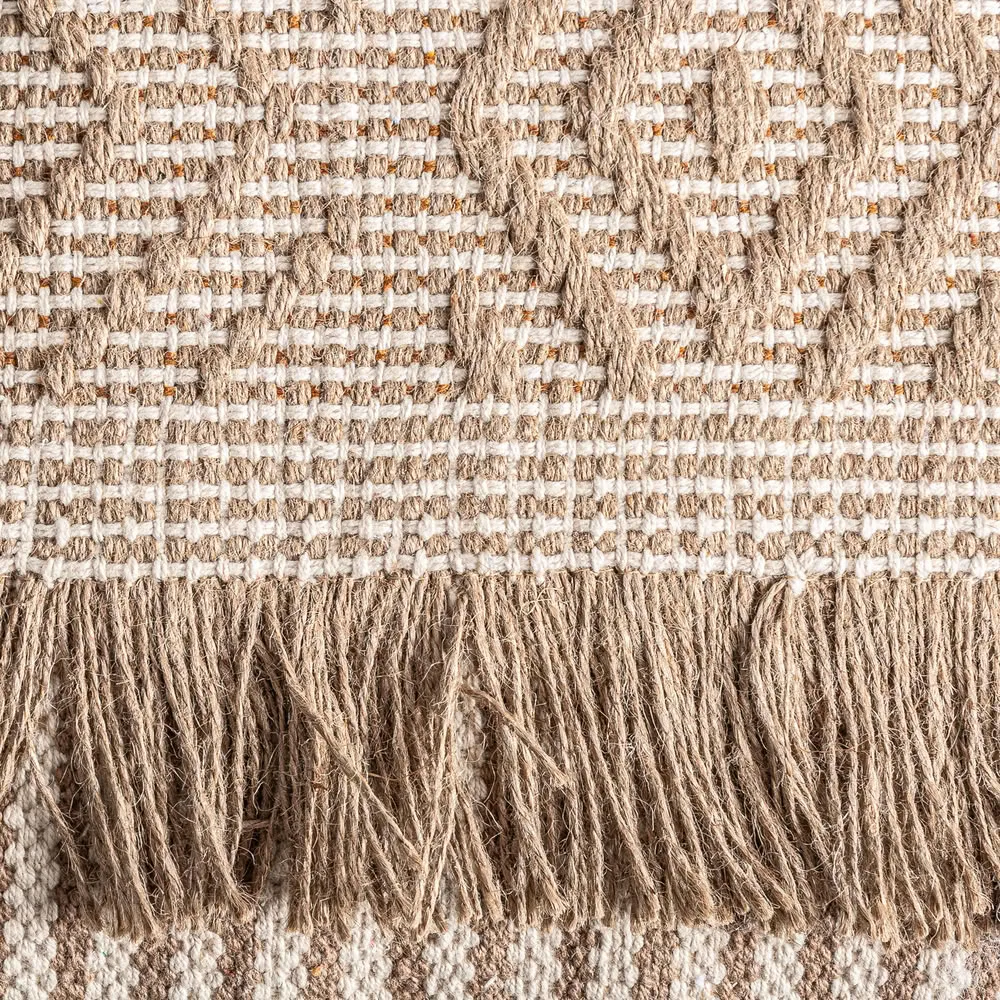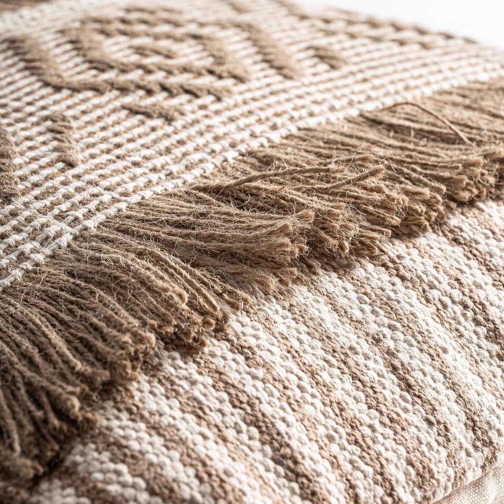 El cojín Serafín de la marca KODU, en tonos beige y marrón, aporta un aire boho sofisticado, perfecto para hogares que buscan texturas naturales. Incluye relleno.