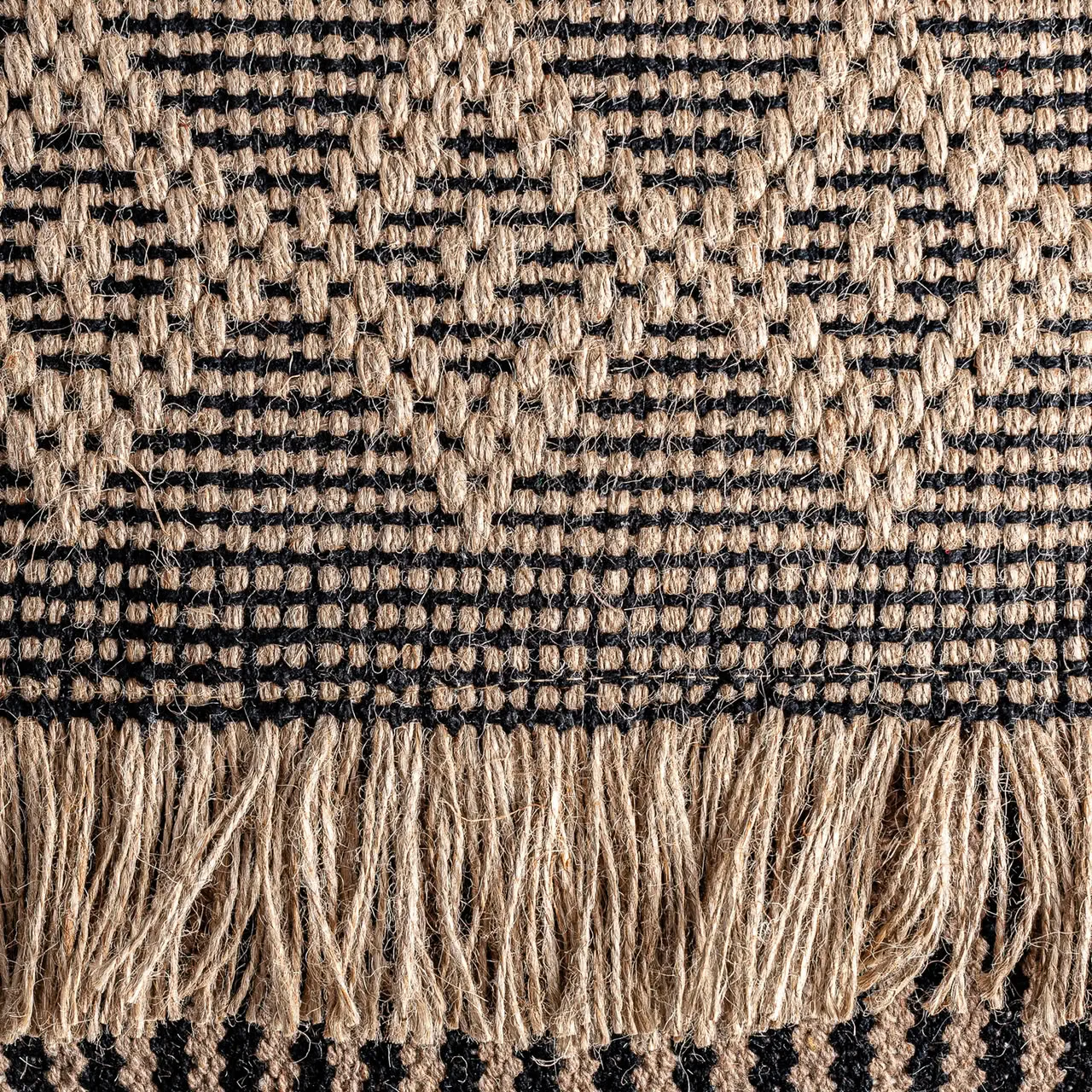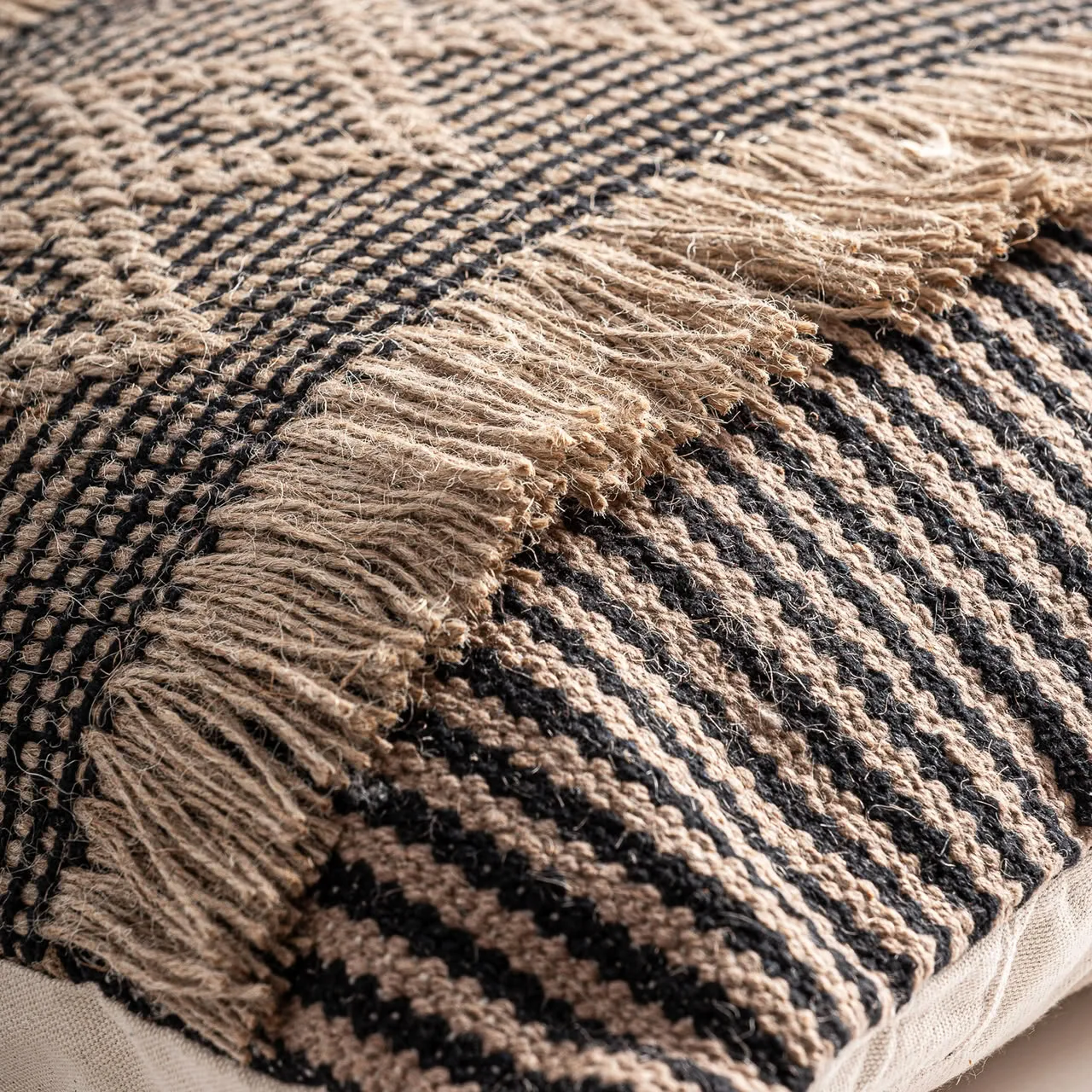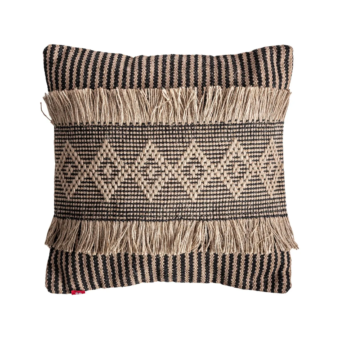 Cojín de yute y poliéster en tonos marrón y negro, una pieza de carácter boho y artesanal que aporta textura y autenticidad al espacio. Su diseño cálido y natural, junto con sus proporciones —45 x 45 cm— lo convierten en un complemento ideal para sofás o camas. Incluye relleno, listo para usar y aportar confort desde el primer momento. Desenfundable.