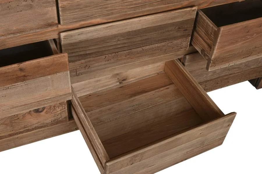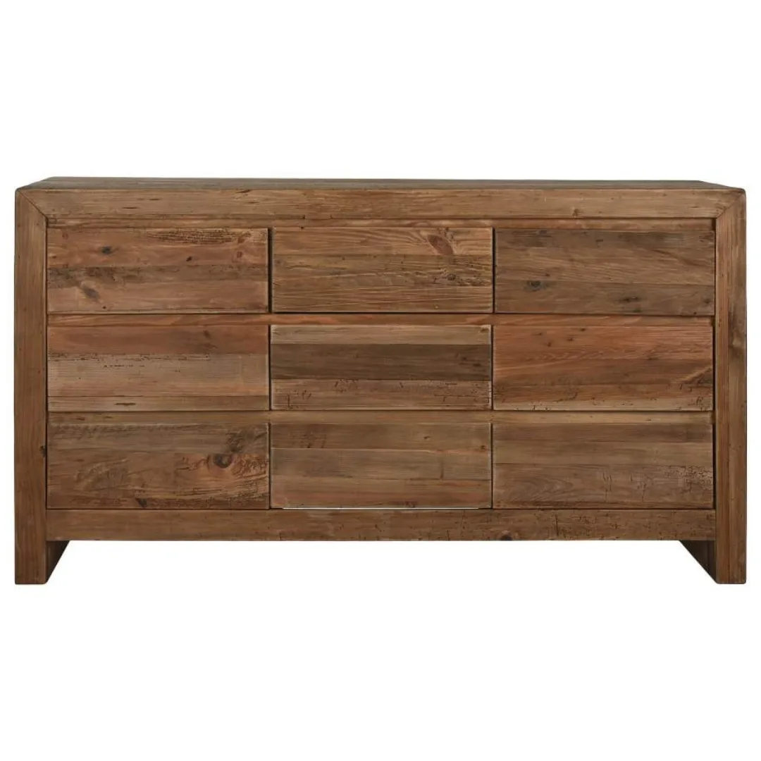 Cómoda de madera reciclada y pino en color natural con 9 cajones, de inspiración alpina y espíritu sostenible. Su gran capacidad de almacenamiento y su construcción con materiales reciclados la convierten en una pieza tan funcional como responsable, ideal para dormitorios y espacios que necesitan orden sin renunciar al encanto rústico de la madera natural. Mide 161 cm de ancho, 48 cm de fondo y 90 cm de alto.