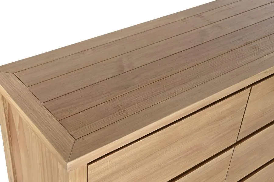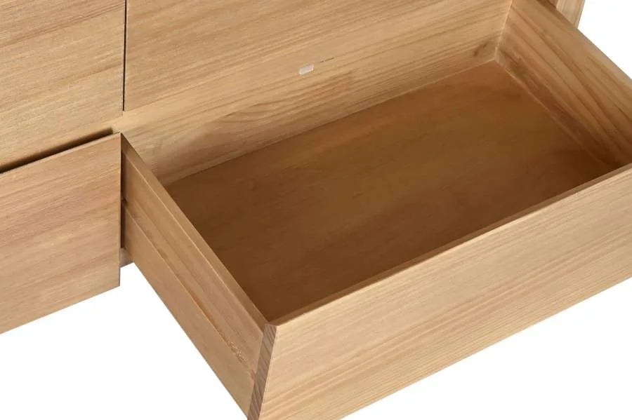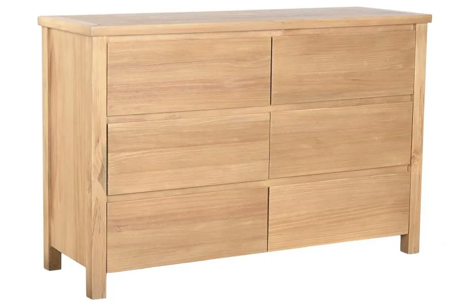 Cómoda de madera de pino en tono natural con 6 cajones, de inspiración alpina y acabado cálido y rústico. Su amplia capacidad de almacenamiento y sus dimensiones generosas la convierten en una pieza imprescindible para dormitorios que buscan orden y calidez. Mide 120 cm de ancho, 40 cm de fondo y 80 cm de alto.