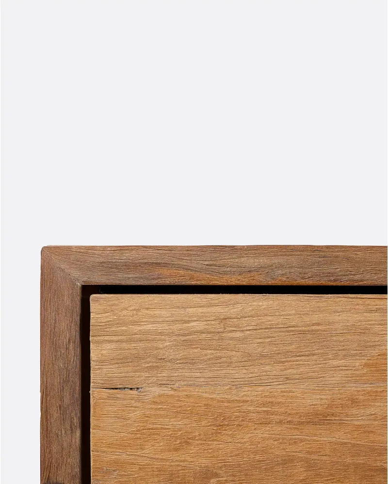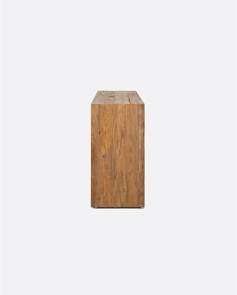 La consola de teca reciclada EROSI de Dareels es una pieza que transmite autenticidad y carácter a través de la materia. Fabricada en madera de teca reciclada, conserva las texturas erosionadas, vetas abiertas y pequeñas irregularidades que el tiempo ha dejado impresas en la madera, convirtiendo cada unidad en una pieza única.