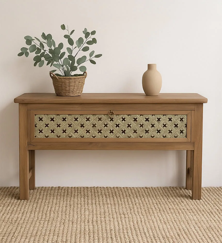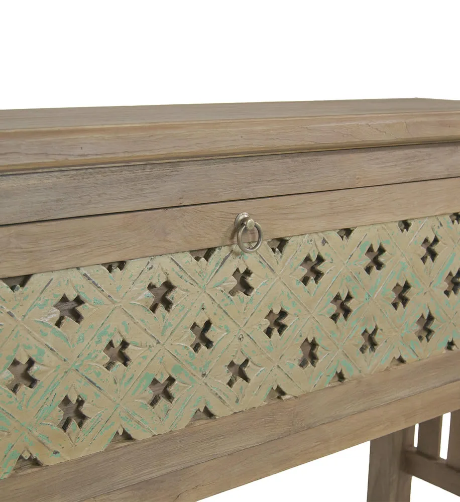La Consola Fez de teca reciclada 1 puerta 150 x 40 cm es una pieza artesanal de líneas sobrias y carácter natural, elaborada en madera maciza de teca reciclada. Su diseño alargado ofrece un espacio de almacenaje discreto gracias a su puerta lateral, manteniendo una estética limpia y equilibrada. Cada consola es única, con variaciones propias del material reciclado que aportan autenticidad y personalidad. Ideal para recibidores o salones de estilo natural, mediterráneo o contemporáneo, con un claro compromiso con la sostenibilidad.