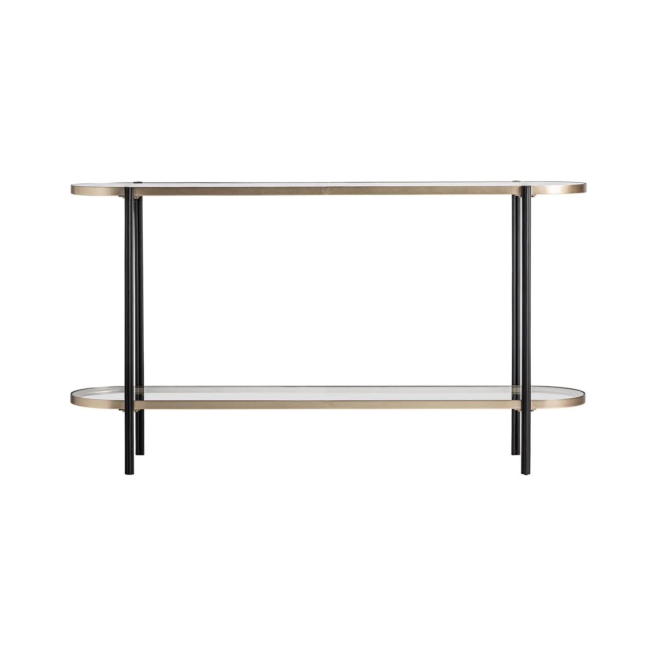 Consola lans de estilo art deco, fabricado en hierro en color negro oro, combinado con cristal. Producto desmontable.