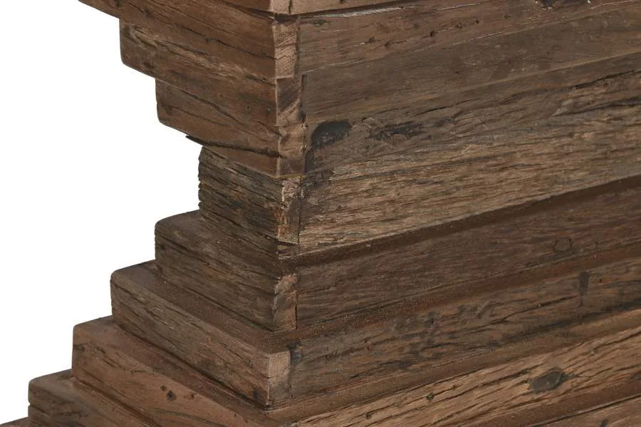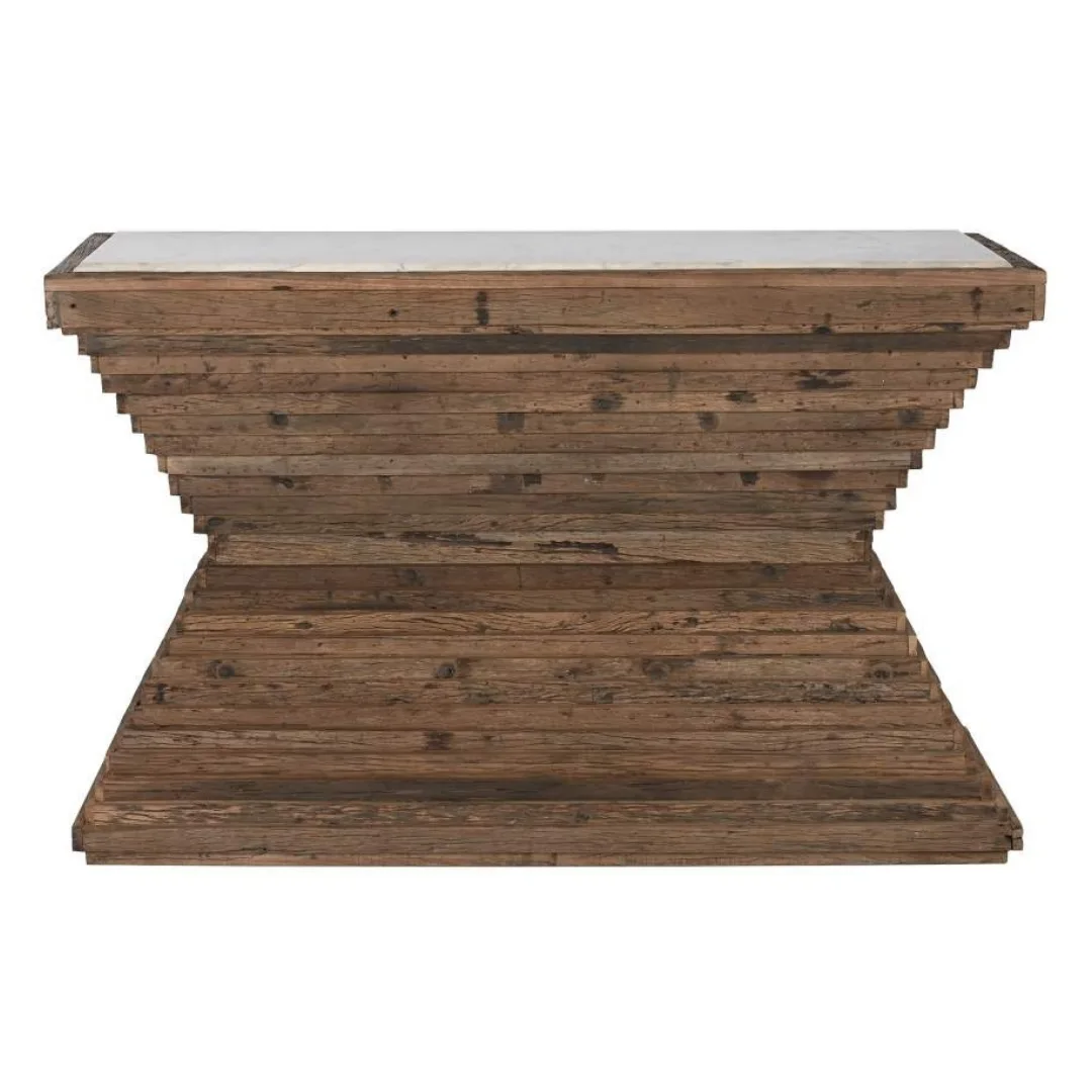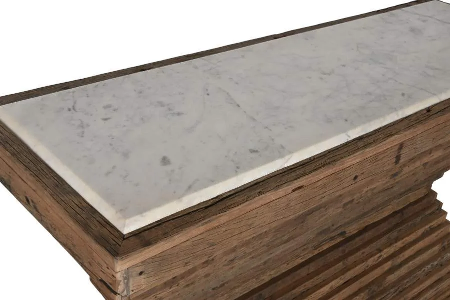 Consola de madera reciclada en color marrón con tablero de mármol blanco, una combinación que fusiona la calidez de los materiales reciclados con la sofisticación mineral del mármol. Su presencia y sus materiales de contraste la convierten en una pieza perfecta para entradas y salones de inspiración india que buscan una consola de madera reciclada y mármol con un acabado elegante y diferencial. Mide 138 cm de ancho, 45 cm de fondo y 87 cm de alto.