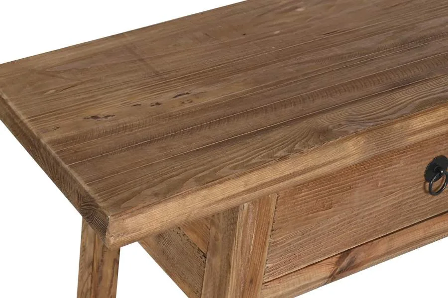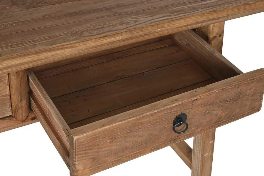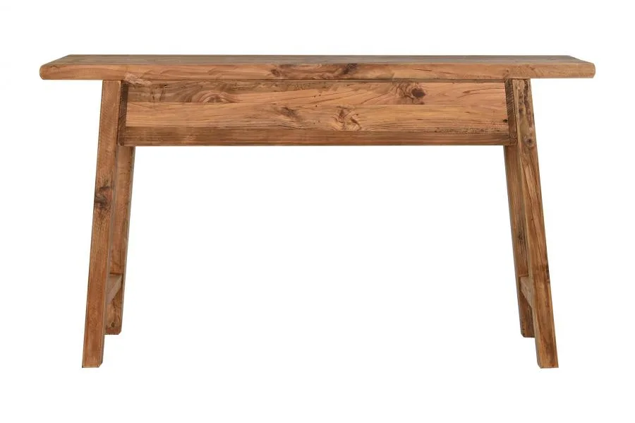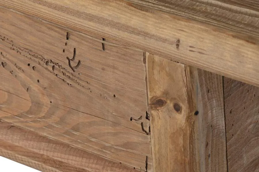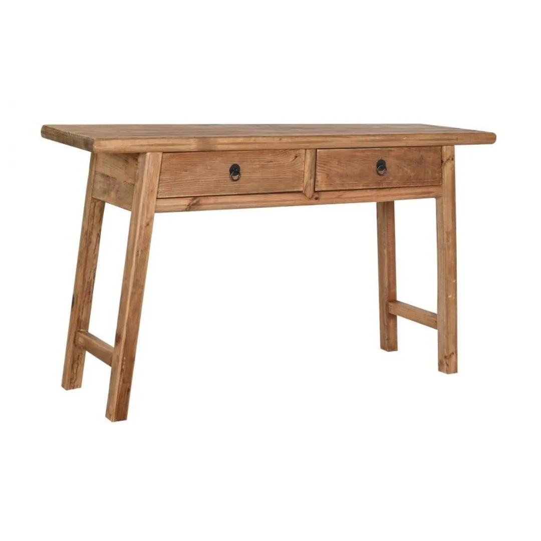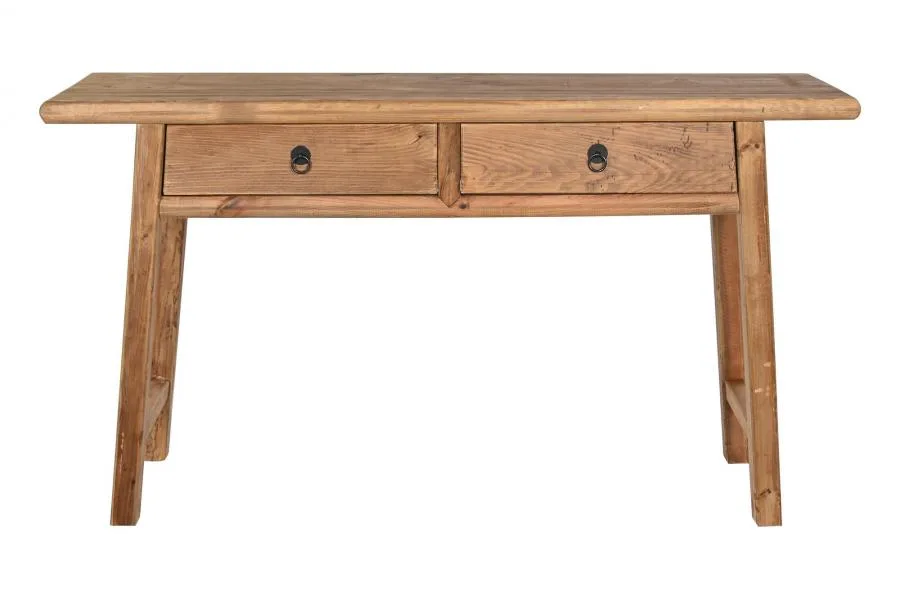 Consola de madera reciclada y pino en color natural con 2 cajones, de inspiración oriental y espíritu sostenible. El veteado y las marcas propias de la madera reciclada hacen de cada pieza un ejemplar único, siendo una opción perfecta para entradas y pasillos que buscan una consola de madera reciclada con cajones con carácter auténtico y alma ecológica. Mide 140 cm de ancho, 38 cm de fondo y 80 cm de alto.