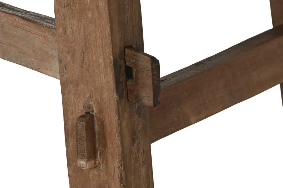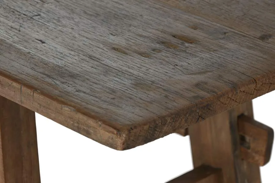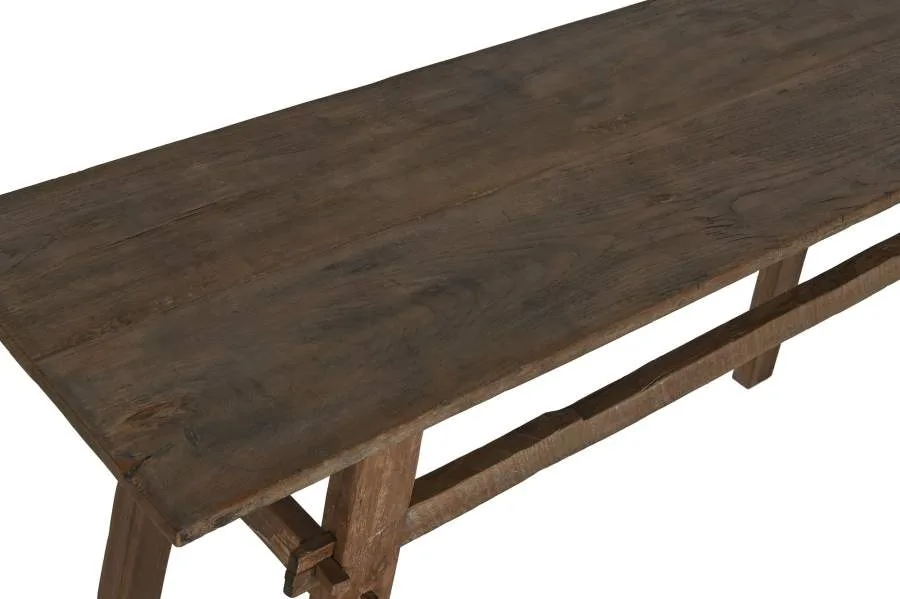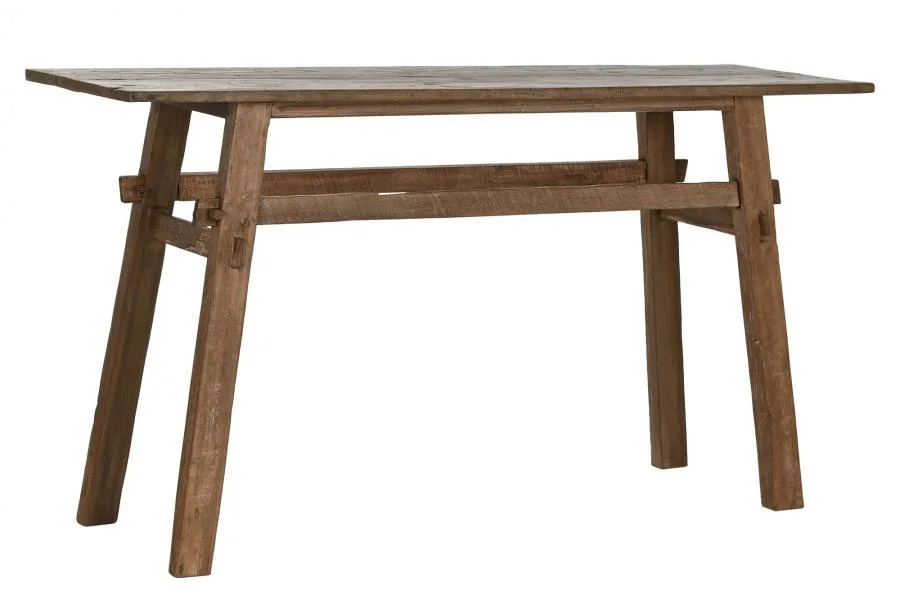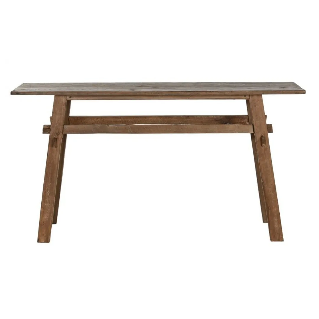 Consola de teca reciclada de diseño minimalista y líneas depuradas. Cada pieza presenta un veteado y una tonalidad únicos propios de la madera reciclada, lo que la convierte en un mueble con historia y carácter para entradas, pasillos o detrás de sofás que buscan sobriedad y sostenibilidad a partes iguales. Mide 140 cm de ancho, 40 cm de fondo y 75 cm de alto.