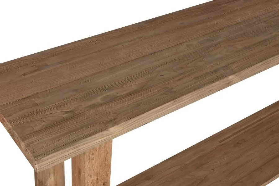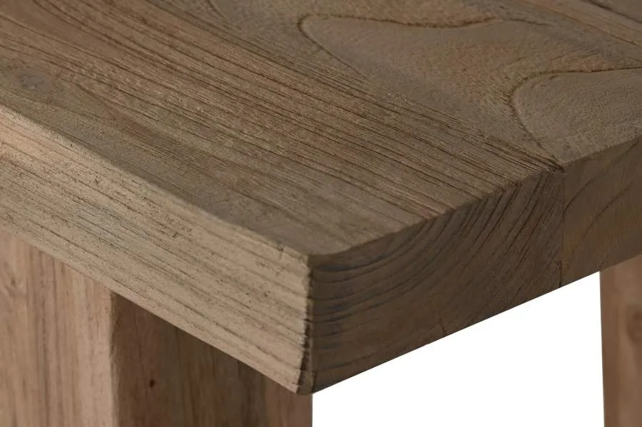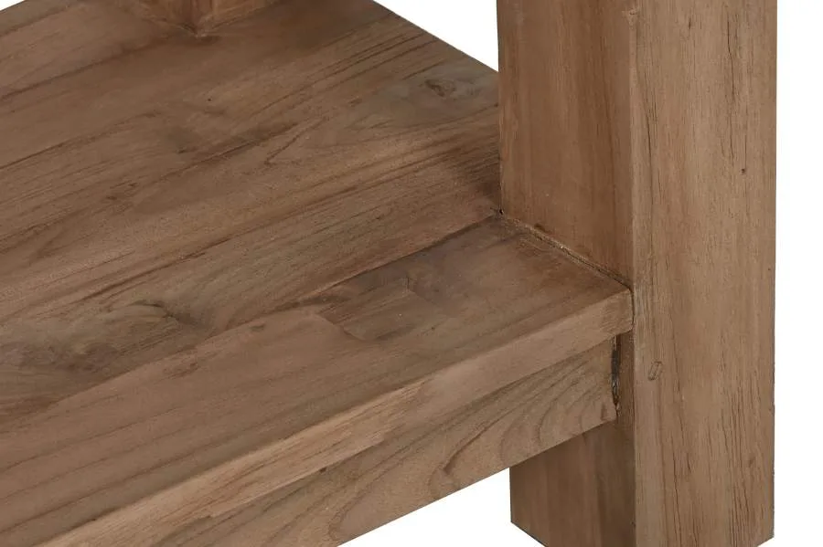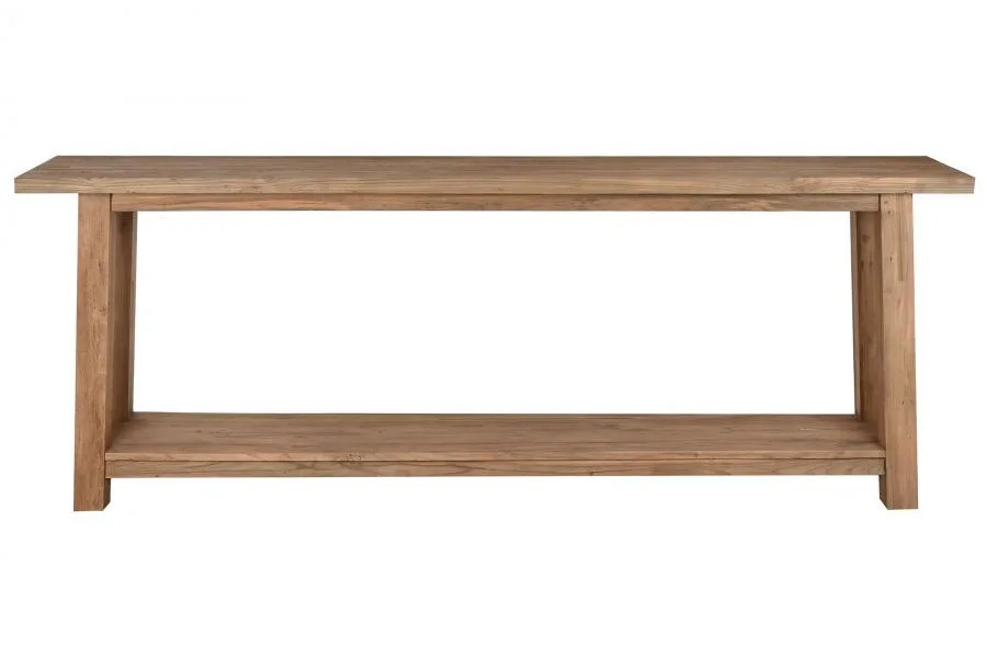 Consola de gran formato de teca reciclada en color natural con estante inferior. Su imponente longitud y la textura auténtica de la teca reciclada la convierten en una pieza protagonista para salones amplios, pasillos y espacios diáfanos que buscan una consola de madera reciclada de gran tamaño con carácter y alma sostenible. Mide 240 cm de ancho, 46 cm de fondo y 90 cm de alto.