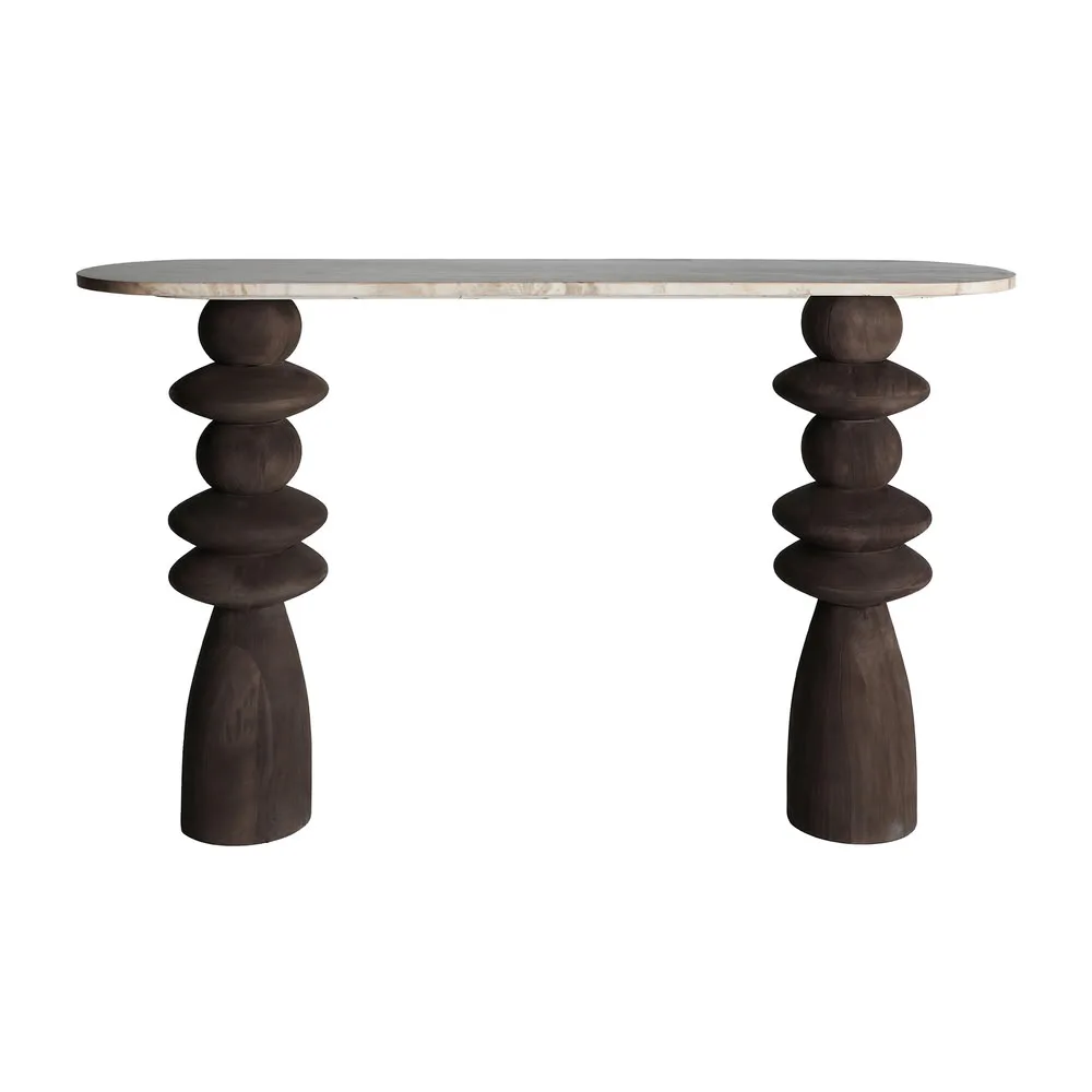 La consola VRADS fusiona escultura y funcionalidad. Con sus patas torneadas en madera de mango marrón y sobre de mármol en tonos cálidos, esta pieza aporta carácter y distinción a entradas o salones.
