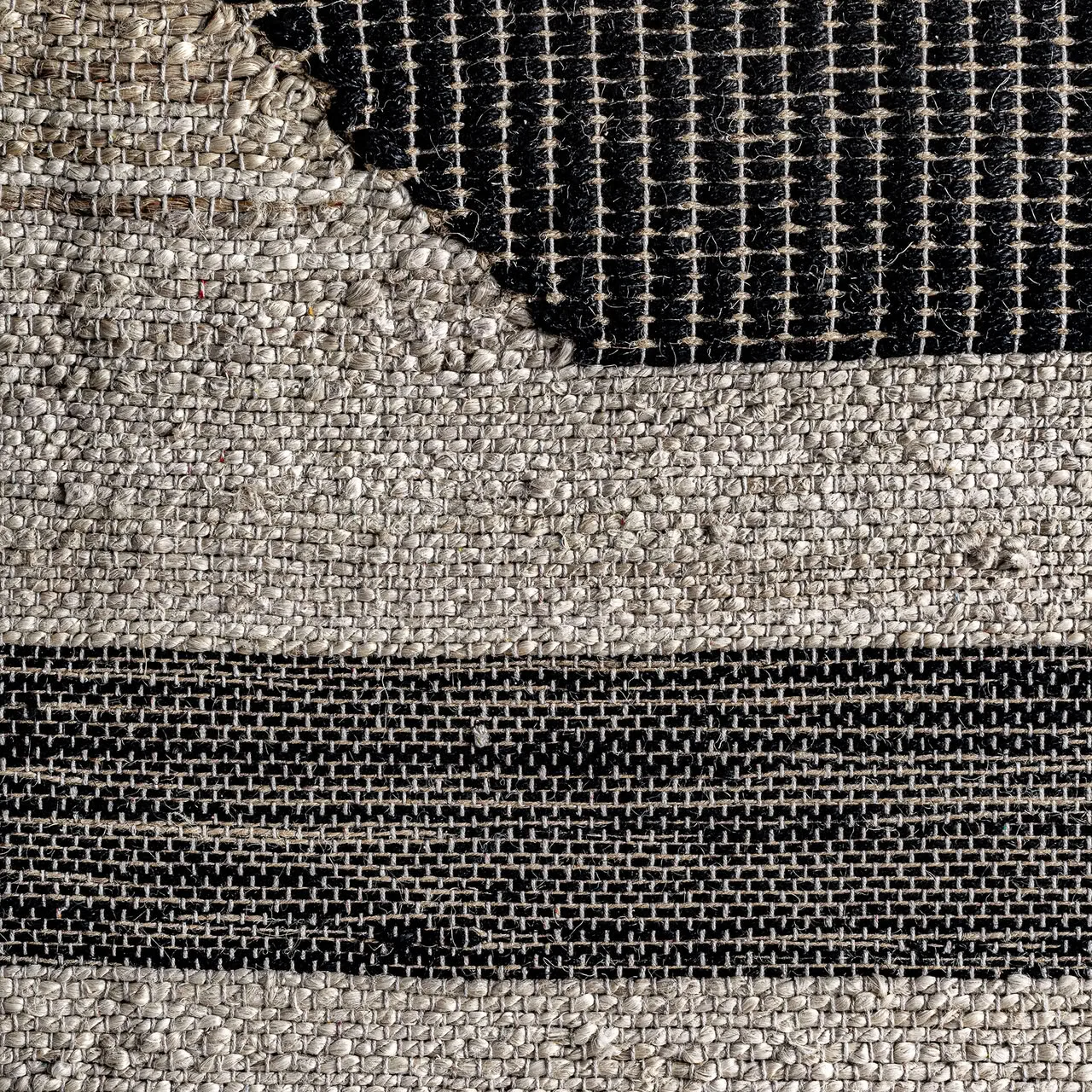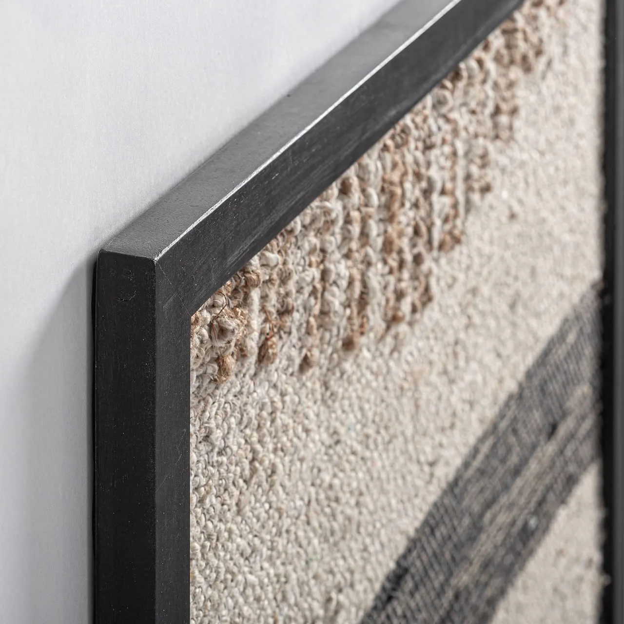 Cuadro Cesc de estilo contemporáneo, fabricado en madera de mango en color negro con acabado artesanal, combinado con yute en color marrón y algodón en color tonos neutros.