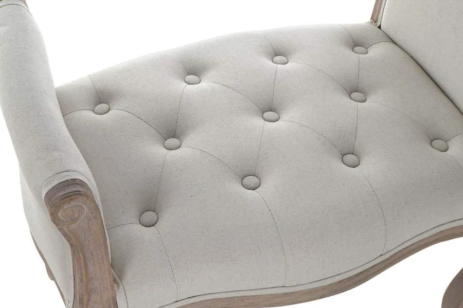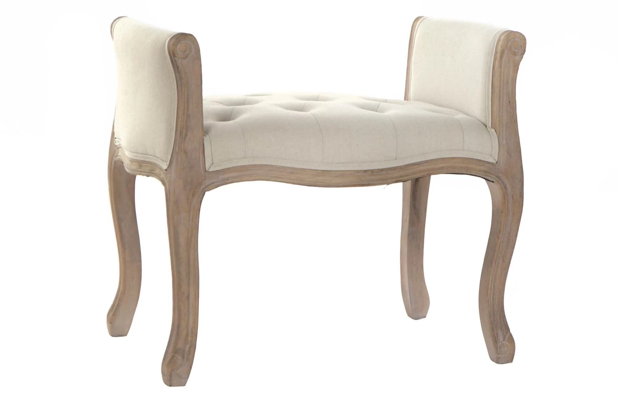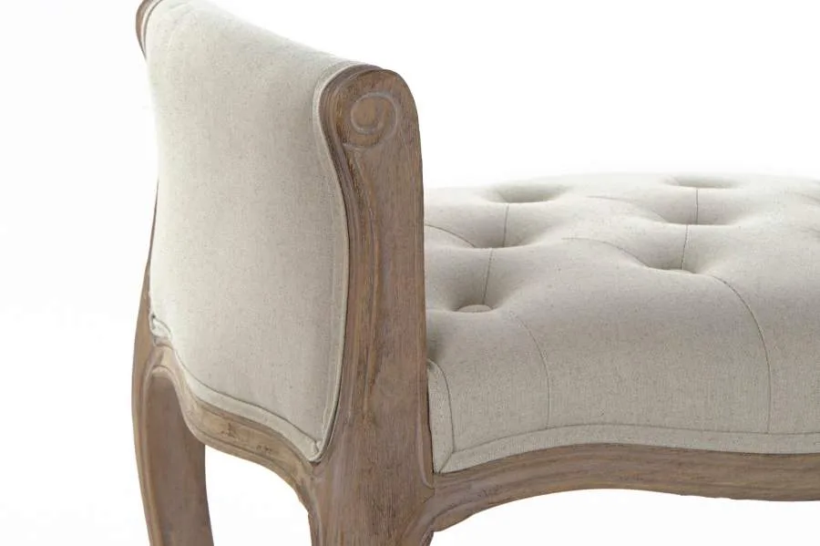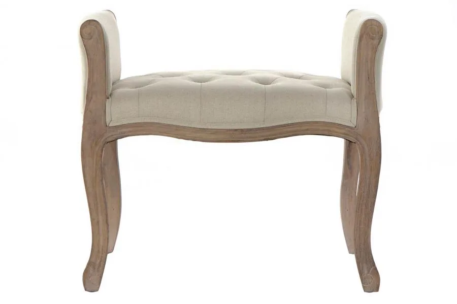 Descalzadora pequeña de rubberwood en color natural con asiento tapizado en lino beige, de estilo tradicional. Su formato compacto la hace perfecta para entradas pequeñas o dormitorios que buscan una descalzadora tapizada en lino con estructura de madera elegante sin ocupar demasiado espacio.