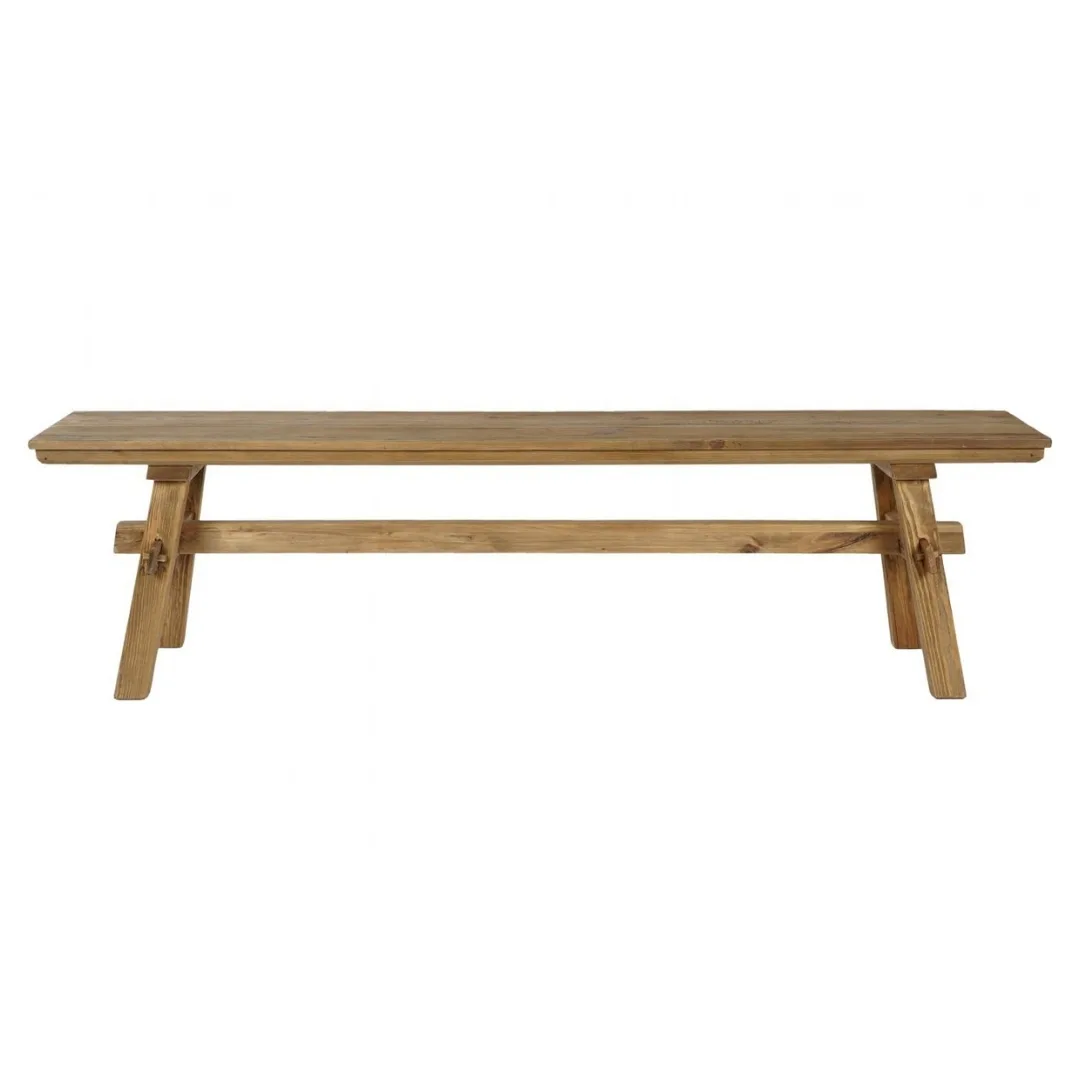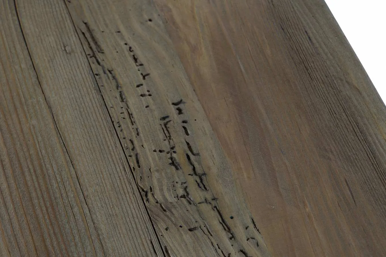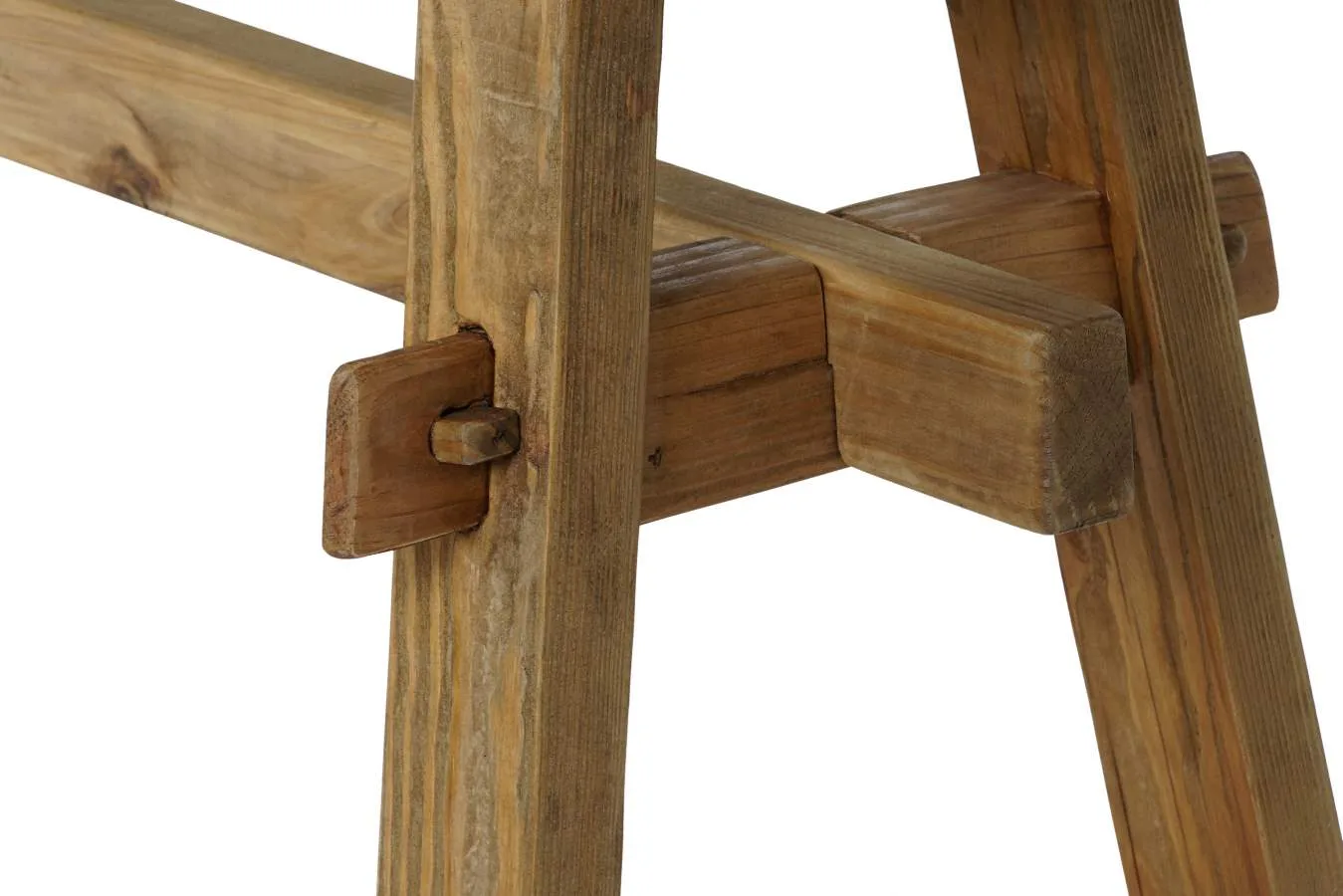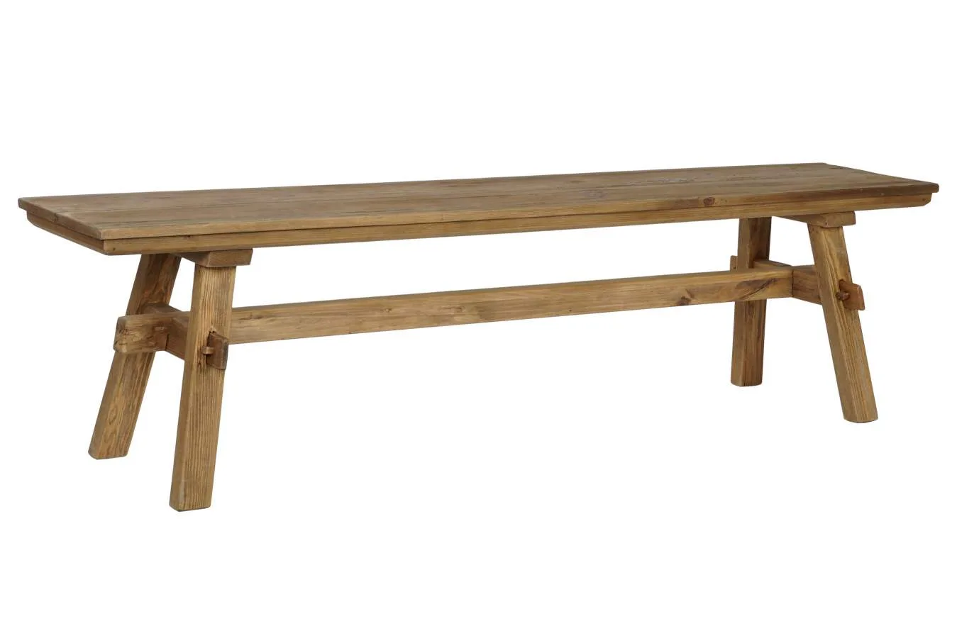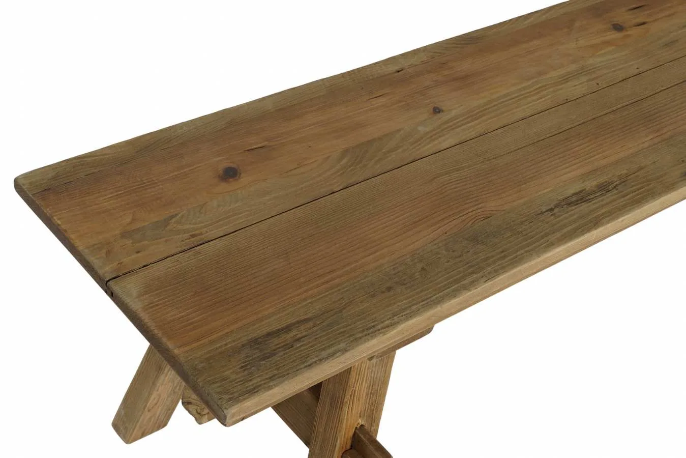 Descalzadora de madera y pino reciclado en color natural, de gran formato e inspiración alpina. Su longitud generosa la convierte en una pieza perfecta para entradas amplias que buscan un banco descalzador de madera reciclada con un acabado rústico, sostenible y con el carácter propio de los materiales con historia. Mide 180 cm de largo, 35 cm de fondo y 47 cm de alto.