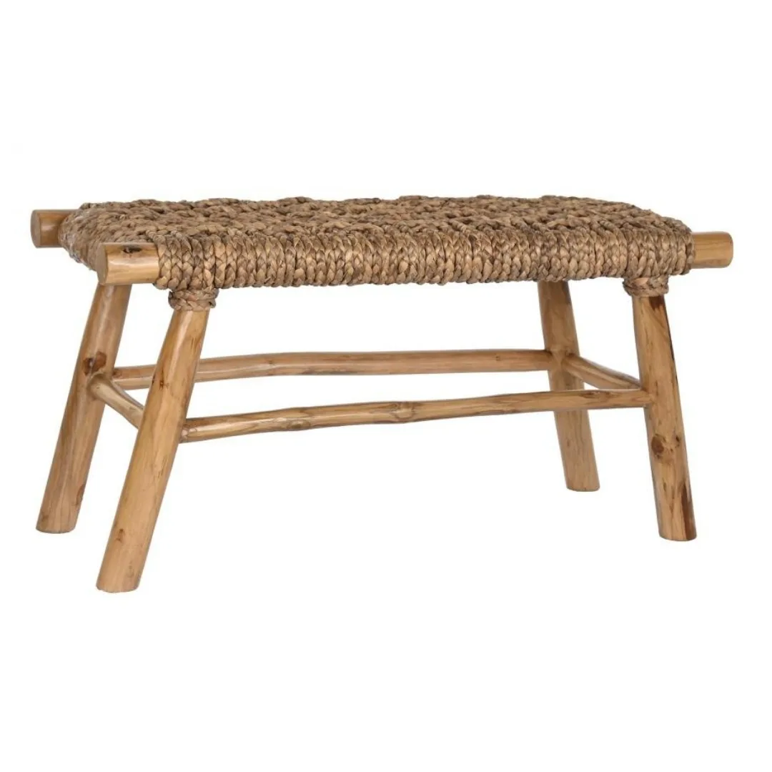 Descalzadora de teca en color marrón claro con asiento de ratán natural, de estilo boho y acabado artesanal. Perfecta para dar la bienvenida en entradas con personalidad, su combinación de teca y ratán aporta calidez y textura sin ocupar demasiado espacio.