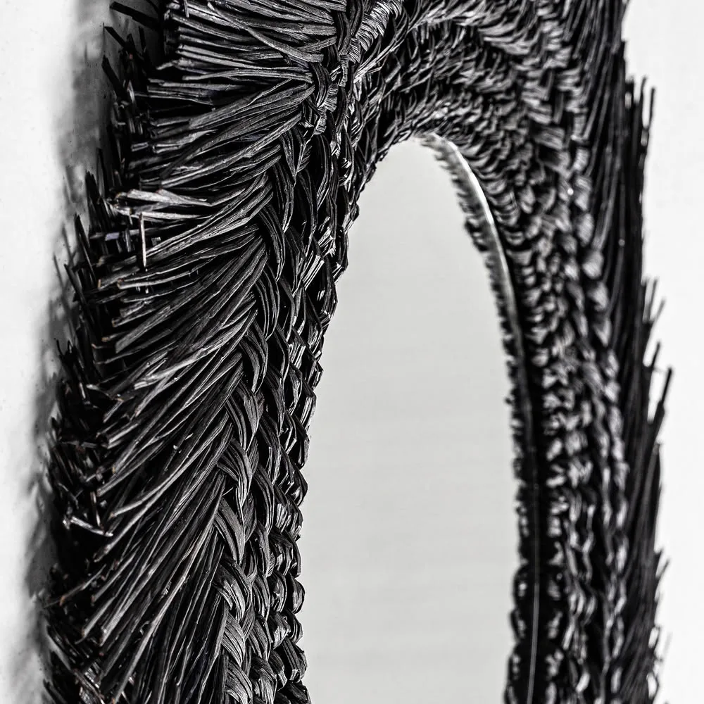 El espejo Desouk, en fibra natural negra, destaca por su textura envolvente y su diseño contemporáneo. VICAL firma esta pieza con su sello inconfundible.