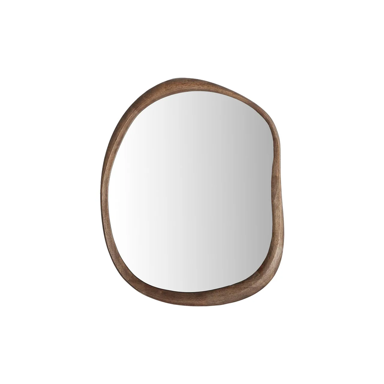 Espejo de madera de caucho en tono marrón con luna de espejo Lubeca de Kodu, una pieza de silueta libre y asimétrica que aporta dinamismo y modernidad. Su diseño orgánico y sus proporciones —64 x 5 x 78 cm— lo convierten en un elemento decorativo con personalidad, ideal para interiores contemporáneos.