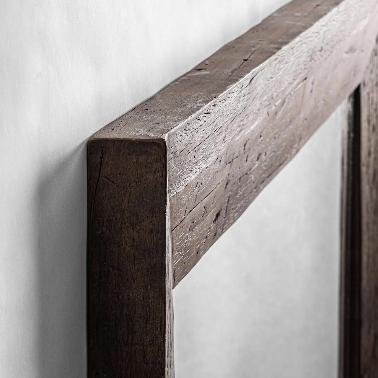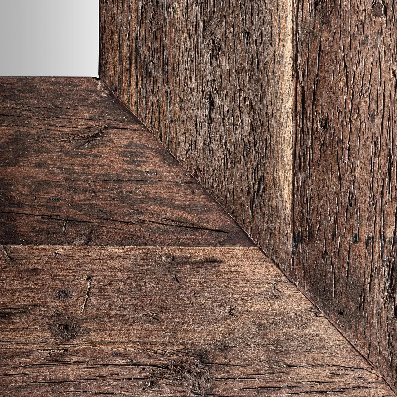 Espejo skorup de estilo colonial, fabricado en madera recuperada en color marrón con acabado envejecido, combinado con espejo.