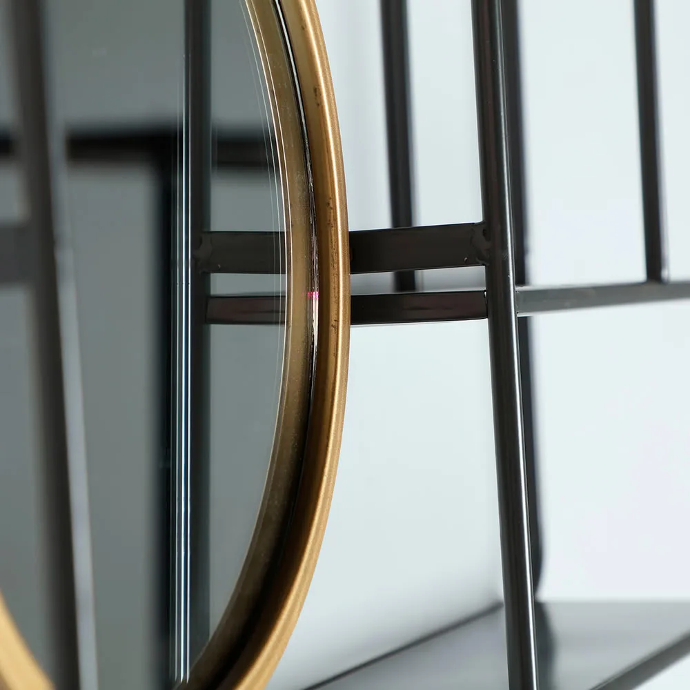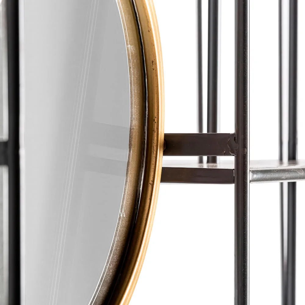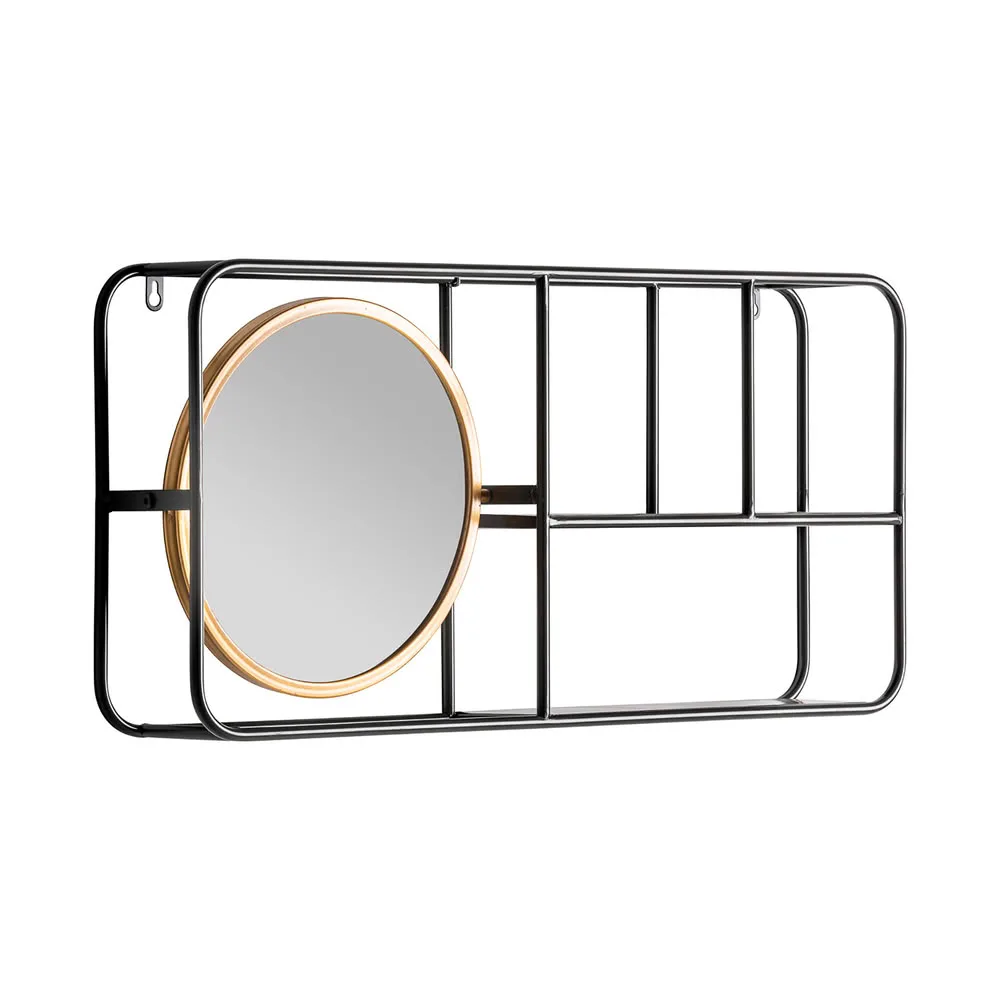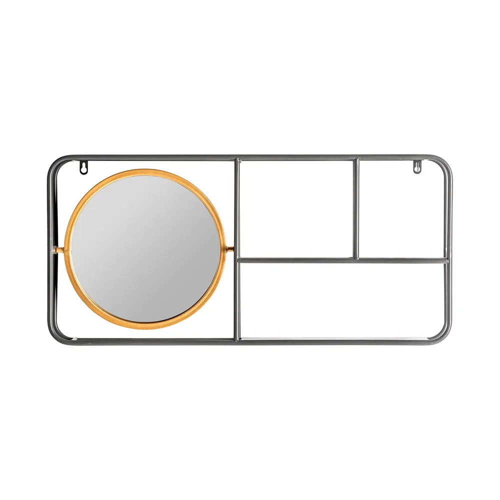 Espejo rectangular varese de estilo industrial, fabricado en hierro en color gris, combinado con espejo en color oro y madera dm.