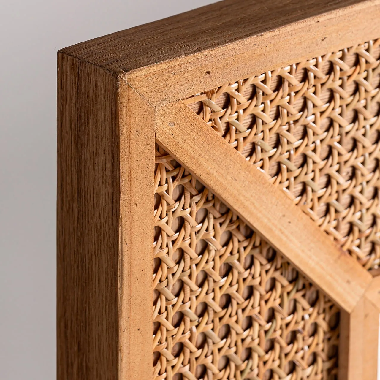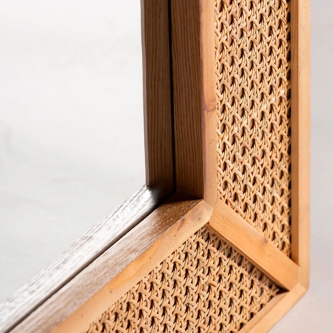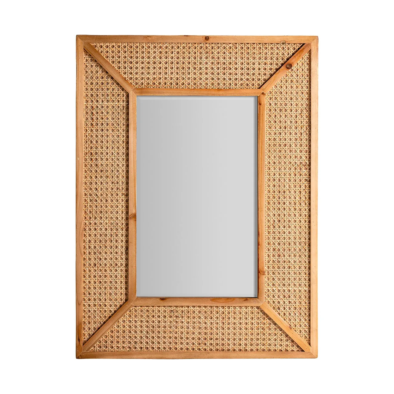 Espejo rectangular zetel de estilo contemporáneo, fabricado en ratán en color marrón, combinado con madera dm y hierro.