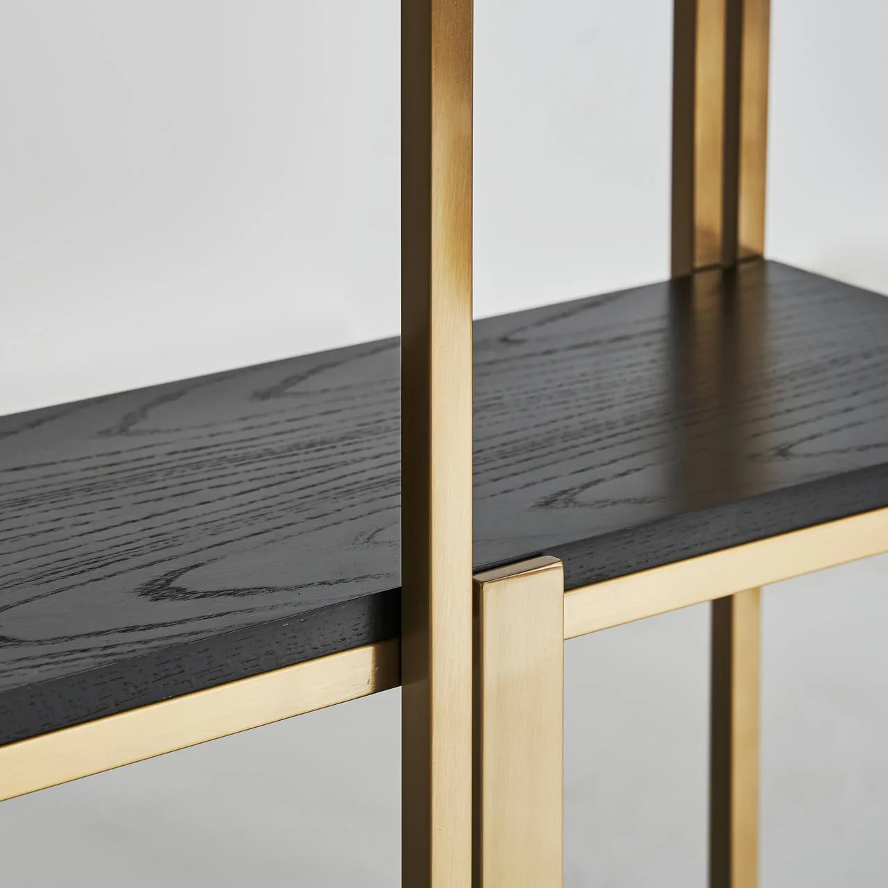 Estanteria leira de estilo art deco, fabricado en acero en color oro, combinado con madera roble en color negro.