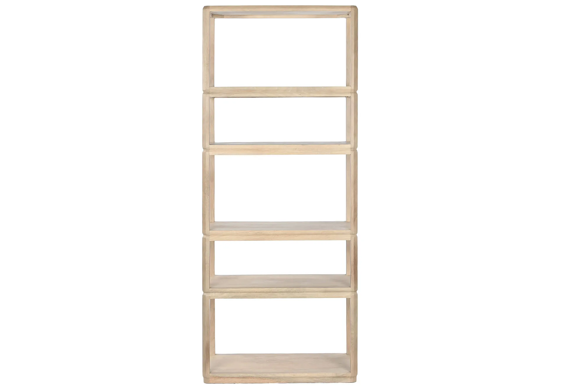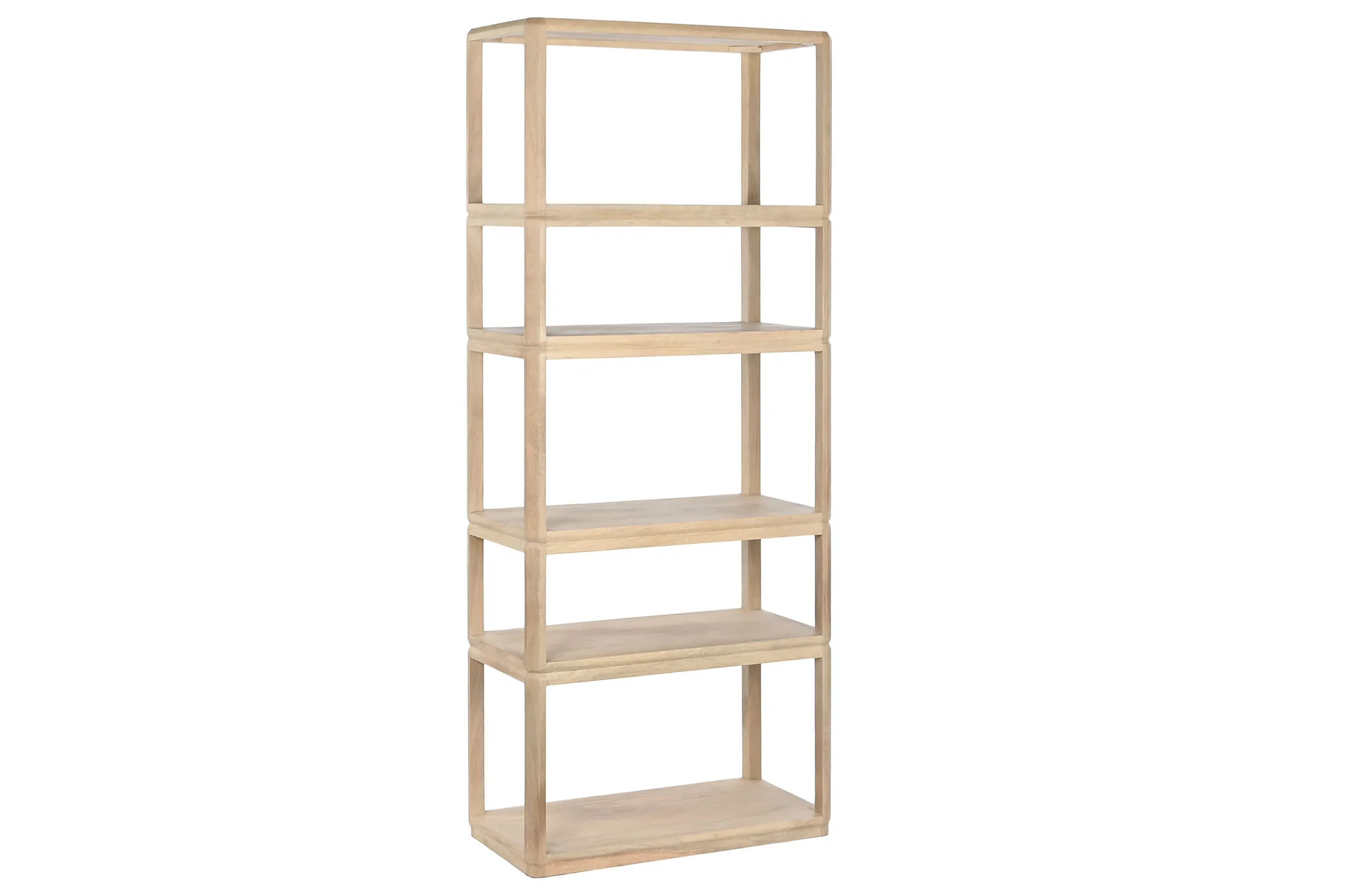 Estantería de madera de mango en color natural con 4 estantes, de diseño moderno y escandinavo. Su formato vertical y estrecho la convierte en una solución de almacenamiento eficiente para salones, estudios y pasillos que buscan una estantería de madera maciza natural esbelta y con presencia sin ocupar demasiado espacio. Mide 80 cm de ancho, 40 cm de fondo y 200 cm de alto.