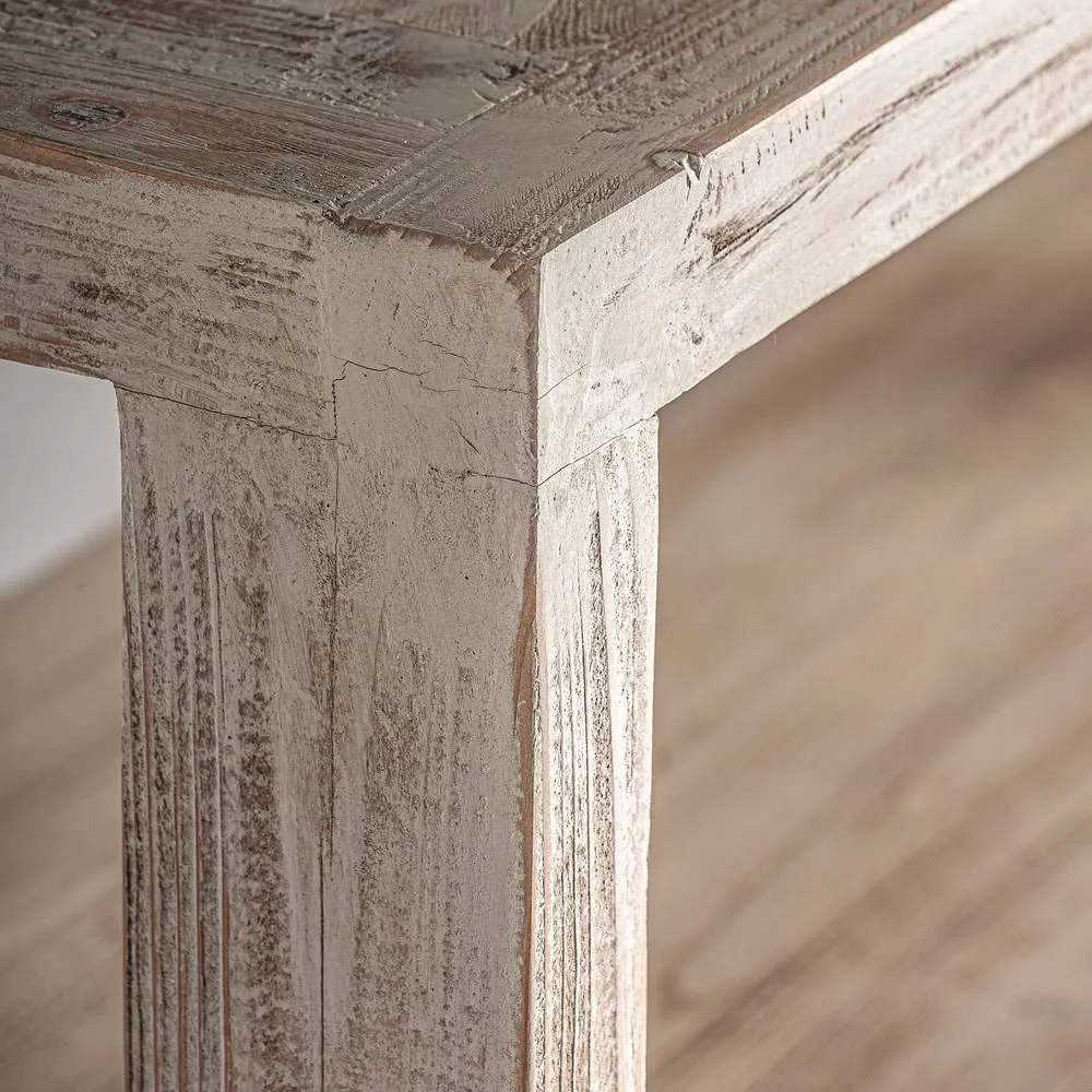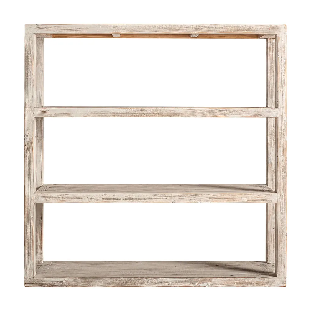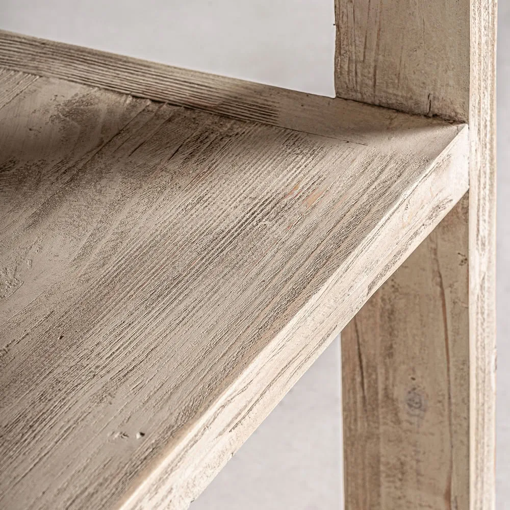 Esta estantería en madera de olmo reciclado blanco con acabado decapado aporta ligereza visual y un marcado encanto colonial. Su diseño abierto y equilibrado permite organizar y exhibir objetos decorativos con naturalidad, mientras el carácter artesanal de la madera le confiere una estética vintage auténtica y llena de personalidad.