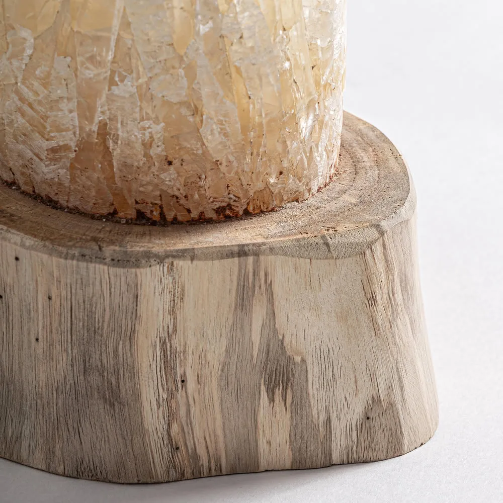 Figura decorativa surtido 0 de estilo nórdico fabricado en cristal en color marfil combinado con madera de teka en color marrón claro.