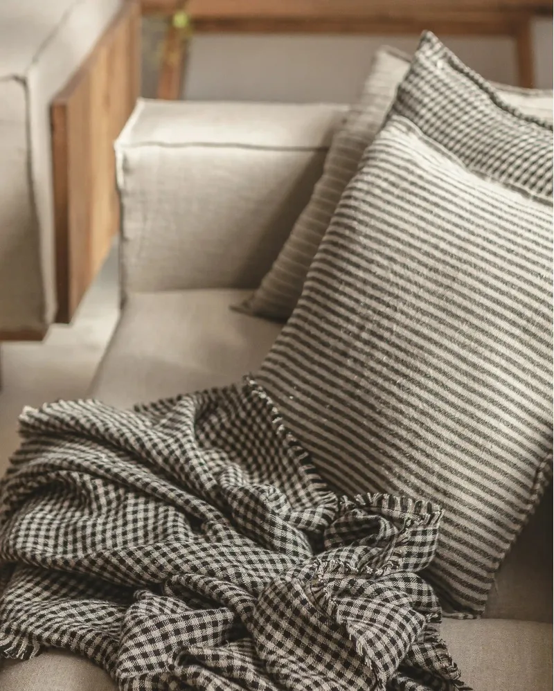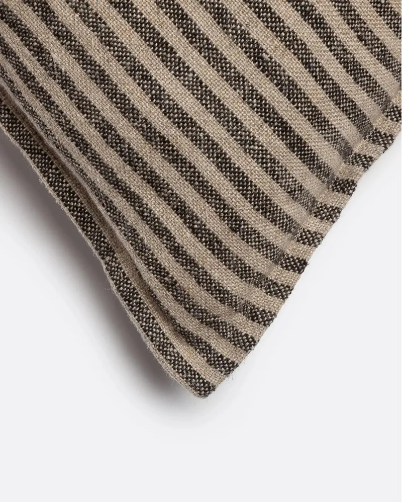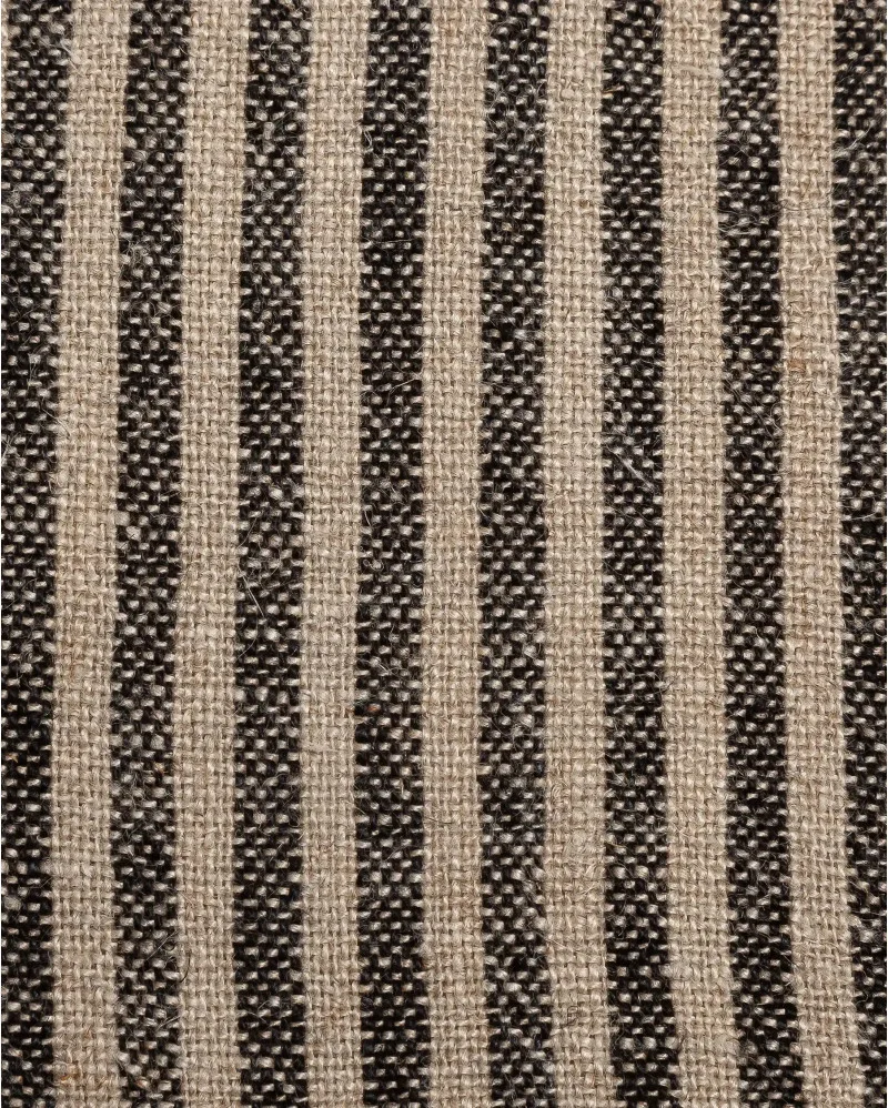Su diseño de rayas negras sobre fondo natural, con textura encordada, aporta un toque gráfico y relajado a cualquier ambiente.
